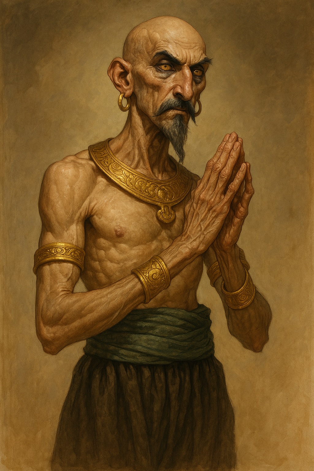 Dalmute âgé à l'apparence inquiétante. Particulièrement grand et maigre, il ressemble à un oiseau de proie. Il a un nez aquilin, les yeux dorés et de lourdes paupières tombantes. Chauve, il arbore une longue barbiche et de très fines moustaches. Ses doigts sont extrêmement longs et fins.