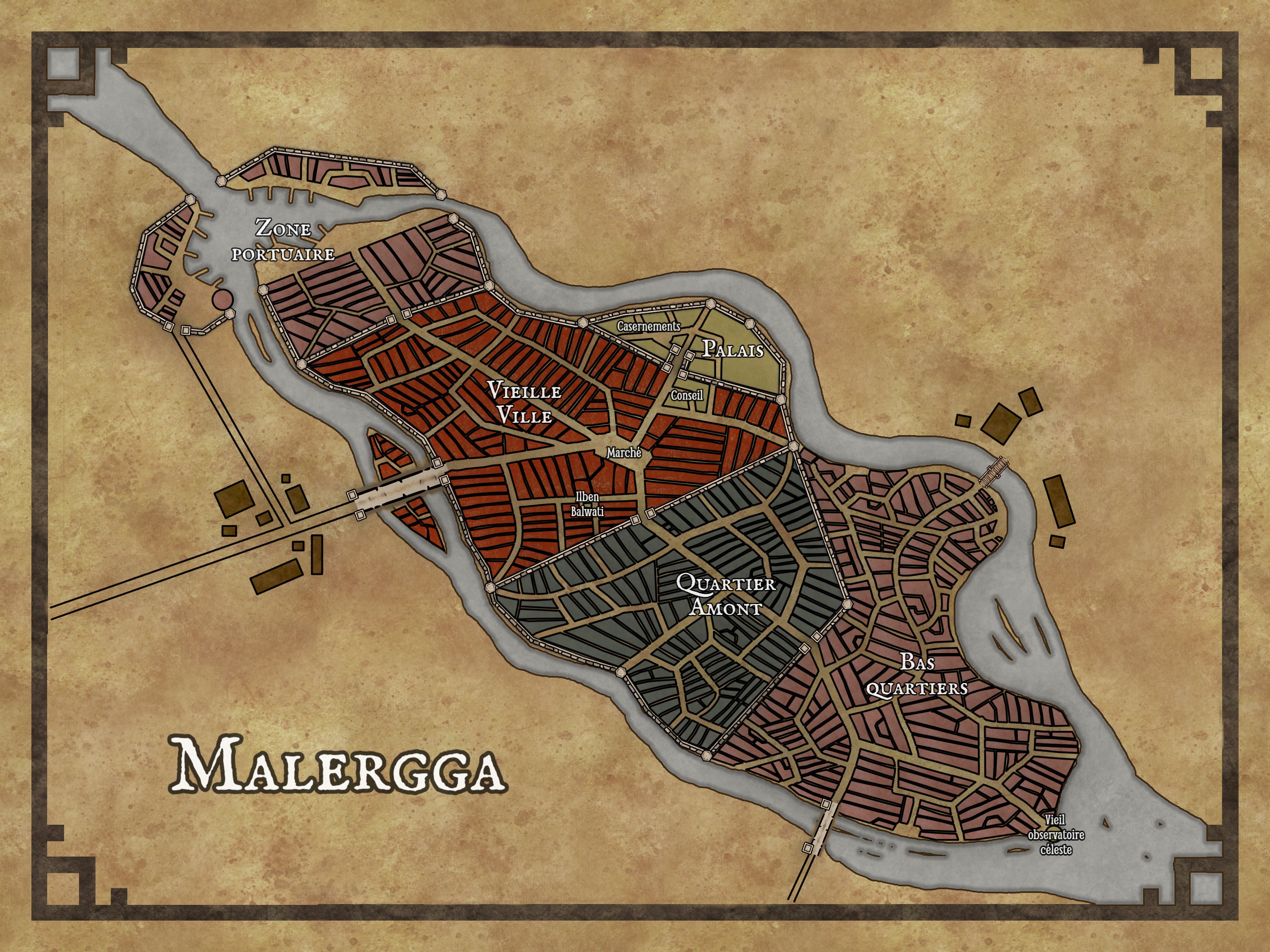 Malergga est la capitale du royaume d’Algerra. C’est une cité ancienne, gangrénée par la criminalité, mais néanmoins accueillante pour peu qu’on connaisse les bonnes adresses et qu’on évite certains secteurs.