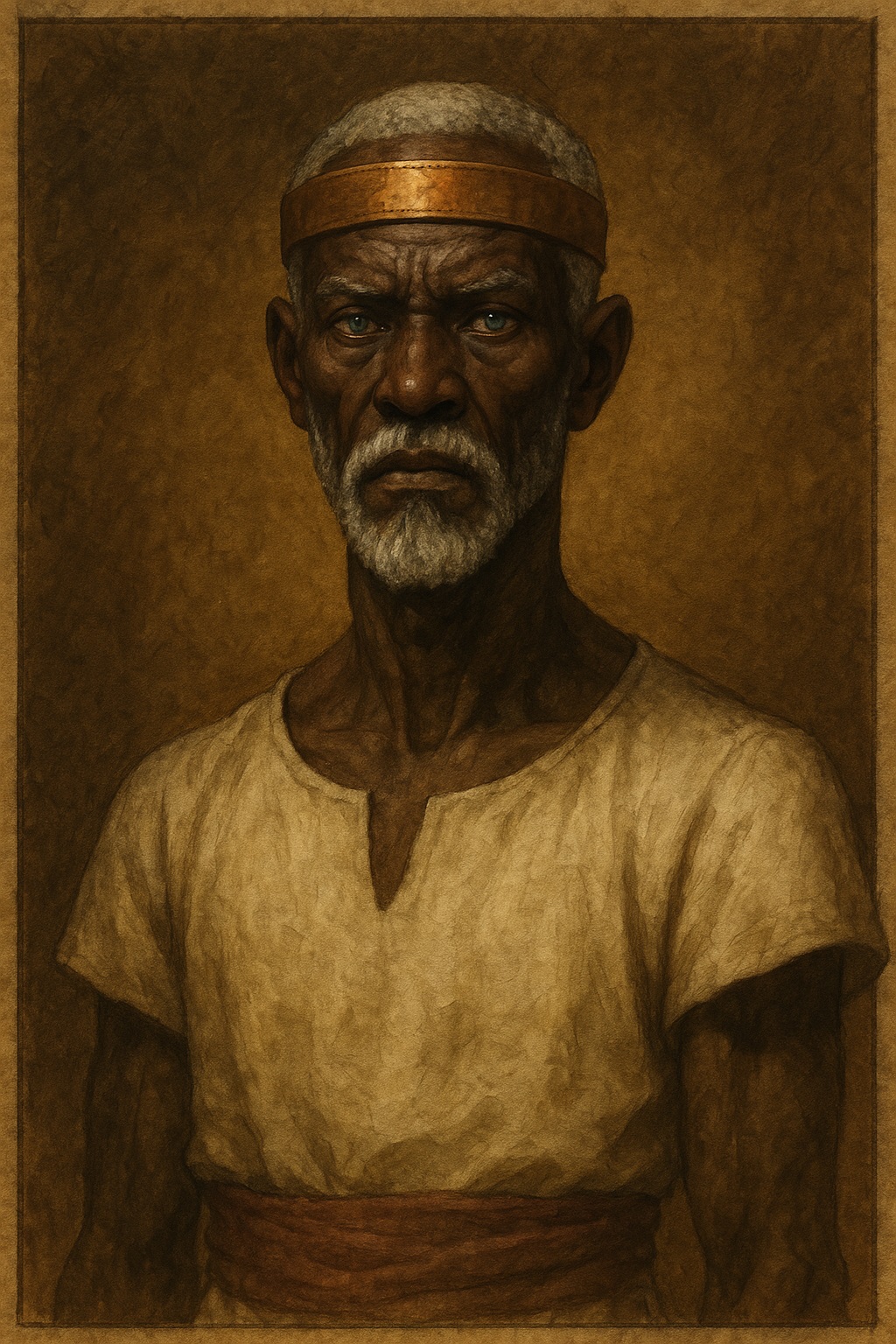 Kirasi. Très sec, il a un maintien très droit, à la limite du guindé. Sa barbe et ses cheveux, coupés courts, sont d’un blanc immaculé, contrastant avec sa peau très sombre. Ses yeux d’un bleu-gris remarquable ressortent au milieu de son visage austère.
