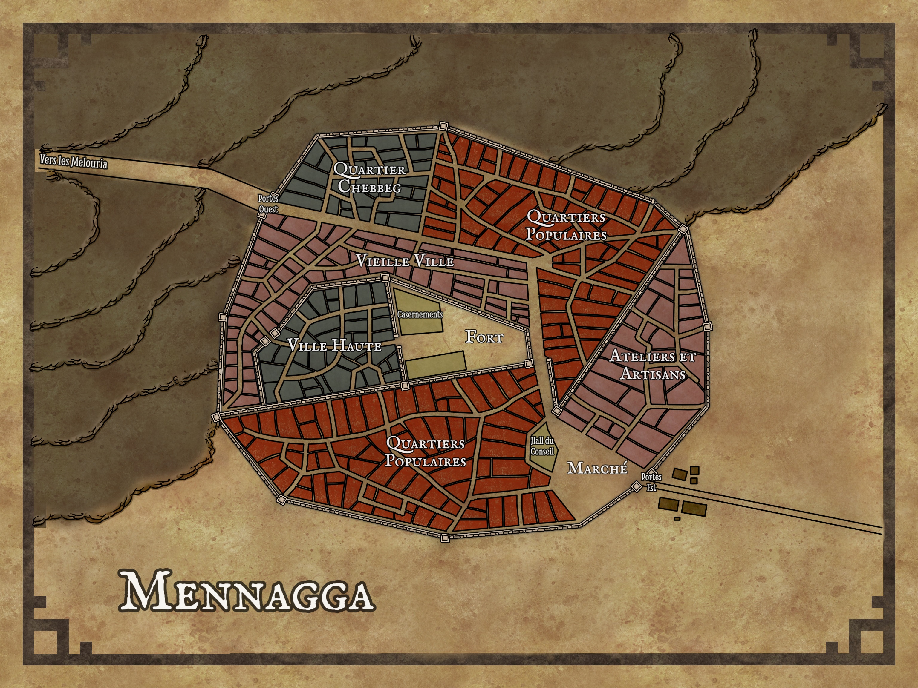 Melouria. C’est principalement une ville de services, et les auberges et tavernes y sont nombreuses. Les rues débordent habituellement de vie, et la vie nocturne y est normalement très animée (les établissements restant ouverts nuit et jour). Mais depuis les ravages de l’épidémie, Mennagga s’est transformée en ville fantôme.