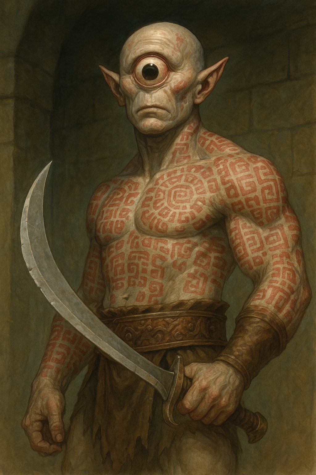 humain de grande taille, à la teinte blafarde. Il est couvert de tatouages alchimiques. Sa tête, disproportionnée et glabre, est ornée en son centre d’un énorme œil unique, mais est dépourvue de nez. Ses oreilles sont longues et pointues.