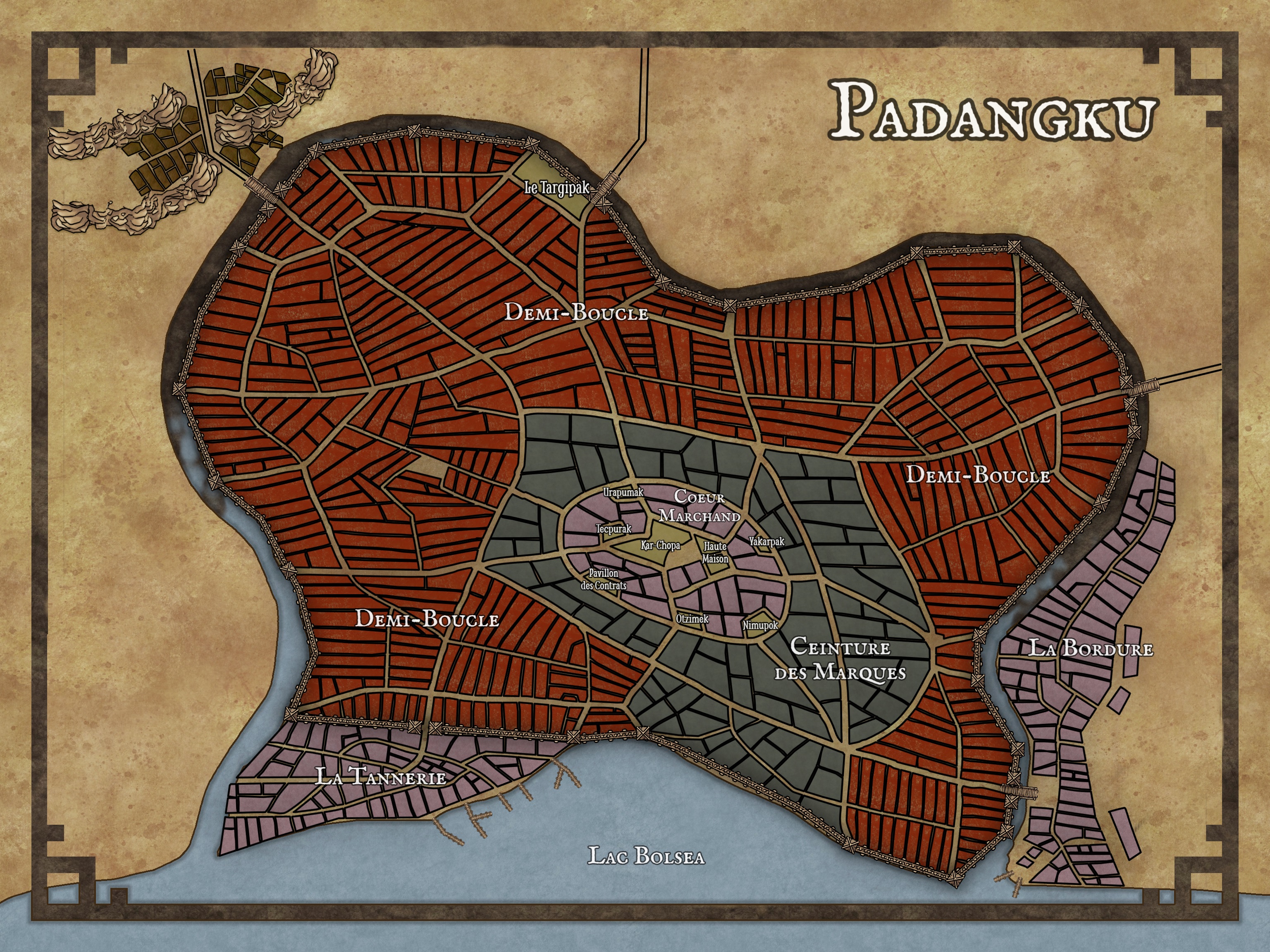 Padangku est une cité étendue, basse et organisée en cercles concentriques autour d’un noyau administratif et commercial central. Les rues principales sont pavées et bordées de caniveaux d’irrigation (et d’évacuation des déchets). Comme dans beaucoup de villes du Liraon, les différents quartiers sont marqués par des enseignes gravées aux couleurs des principaux chopekas locaux. Installées un peu partout, des lanternes en papier diffusent une douce lueur sitôt la nuit tombée. Les bâtiments suivent le style makutari traditionnel, tout en bois et papier d’amate. Les grandes demeures des chopekas et les entrepôts officiels sont quant à eux renforcés par des soubassements en pierre calcaire, capables de résister aux petites secousses sismiques. La plupart des bâtiments possèdent des jardins suspendus, accrochés aux balcons et aux rambardes, permettant ainsi aux habitants de cultiver des plantes médicinales ou comestibles (dont le fameux tirkaya). Quatre secteurs principaux organisent la ville : la Tannerie, le Cœur Marchand, la Ceinture des Marques et la Demi-Boucle. En périphérie s’étendent quelques quartiers modeste (voire très pauvre) supplémentaires, sans réelle organisation.La Tannerie