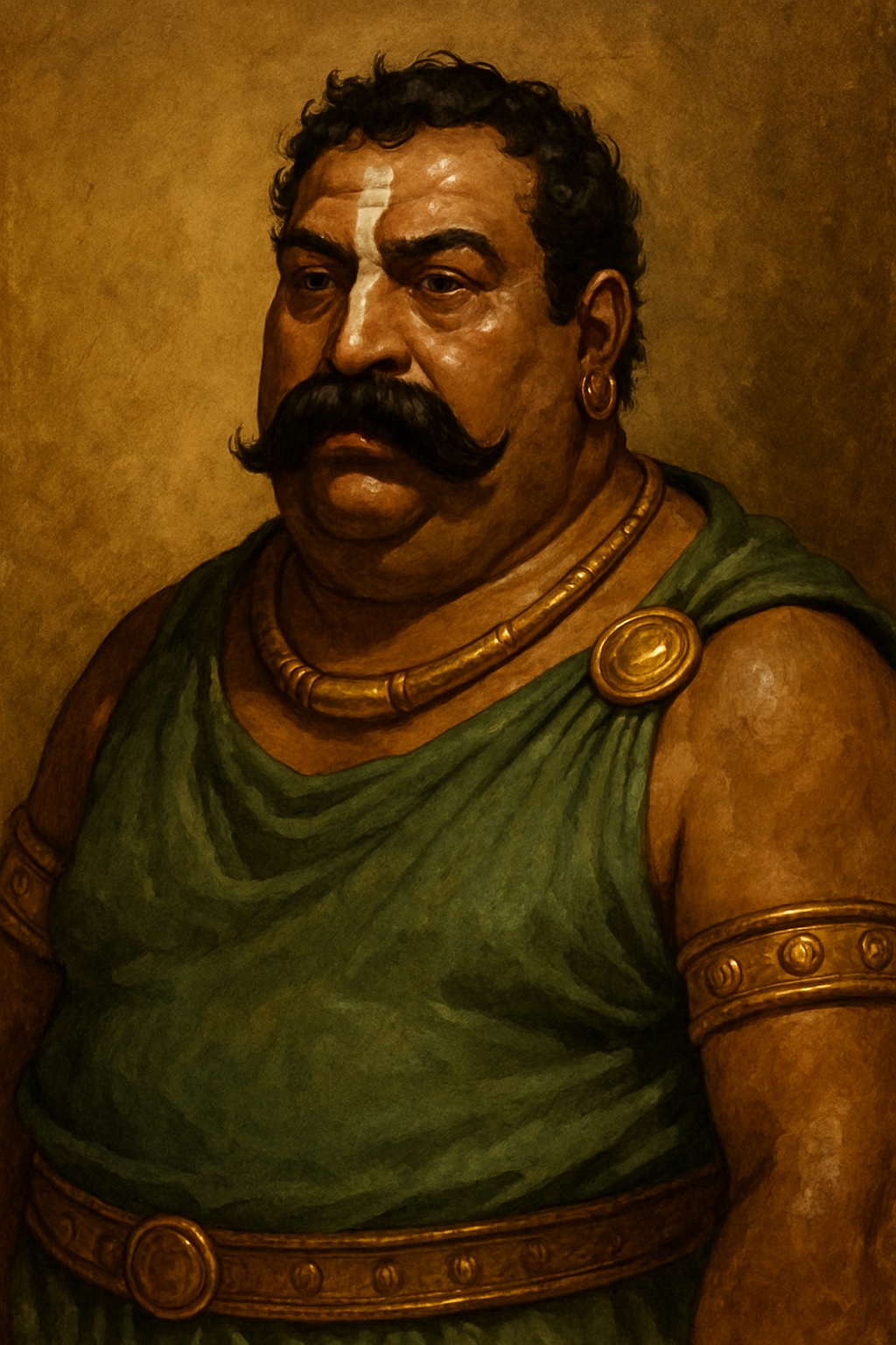 Amonéen ventripotent d’assez petite taille. Sa peau brune est luisante de graisse, de même que ses cheveux bouclés. Son nez busqué surmonte une impressionnante moustache où se perdent souvent des miettes.