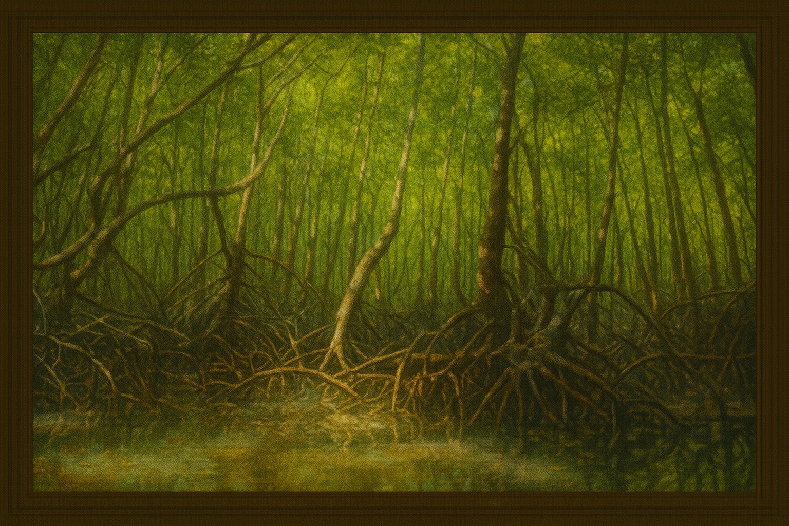 Les arbres de la région sont de grandes mangroves aux racines aériennes. Entre ces racines s'accrochent des mousses filamenteuses et des coquillages en grappe.