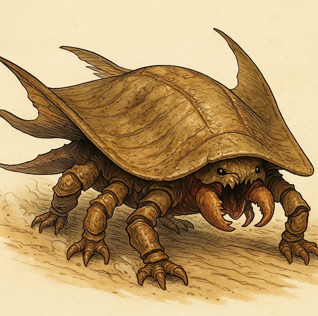 Le corps de la créature est assez plat, protégé de plaques chitineuses de crustacé. Six courtes pattes permettent à la créature de se propulser dans les sables et de grimper sur les rochers. Dépourvue de cou, sa tête est partiellement protégée par la carapace. Elle est pourvue de deux paires de mandibules (une grosse et une plus petite, dessous). Les yeux sont de petites billes d’onyx qui sont protégées d’une membrane lorsque la créature est enfouie sous les sables.