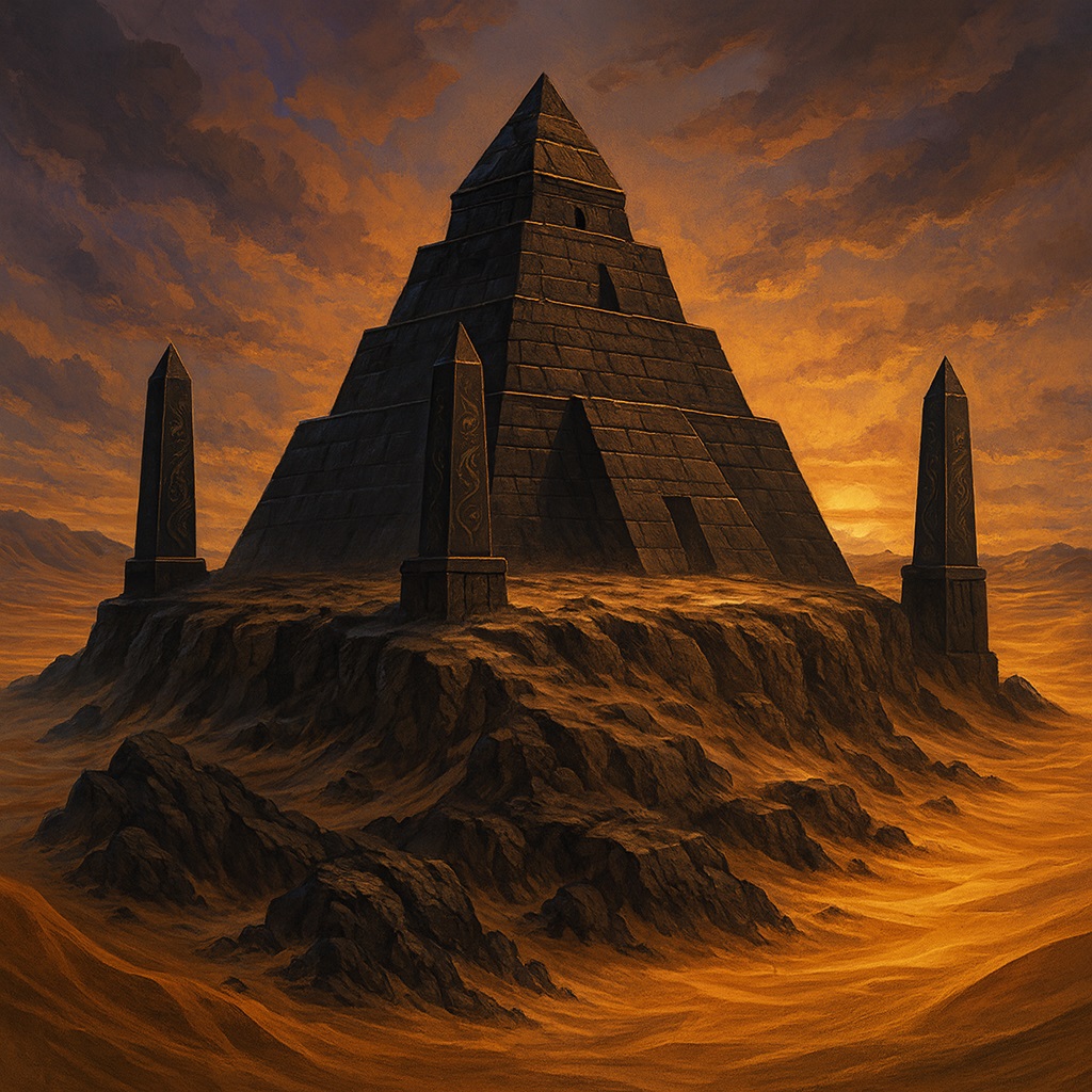 Le Temple des Ondées est construit sur un plateau rocheux surplombant une grande île désolée. Il s’agit d’une grande pyramide tronquée, en basalte noir. Haute de 60 mètres, construite en paliers sur une vaste plateforme, elle est surmontée à son sommet d’une plus petite structure également en forme de pyramide, mais dotée que de trois côtés. La pyramide a pour seule accès visible une porte à sa base, mais elle est obstruée par d'immenses blocs de basalte.