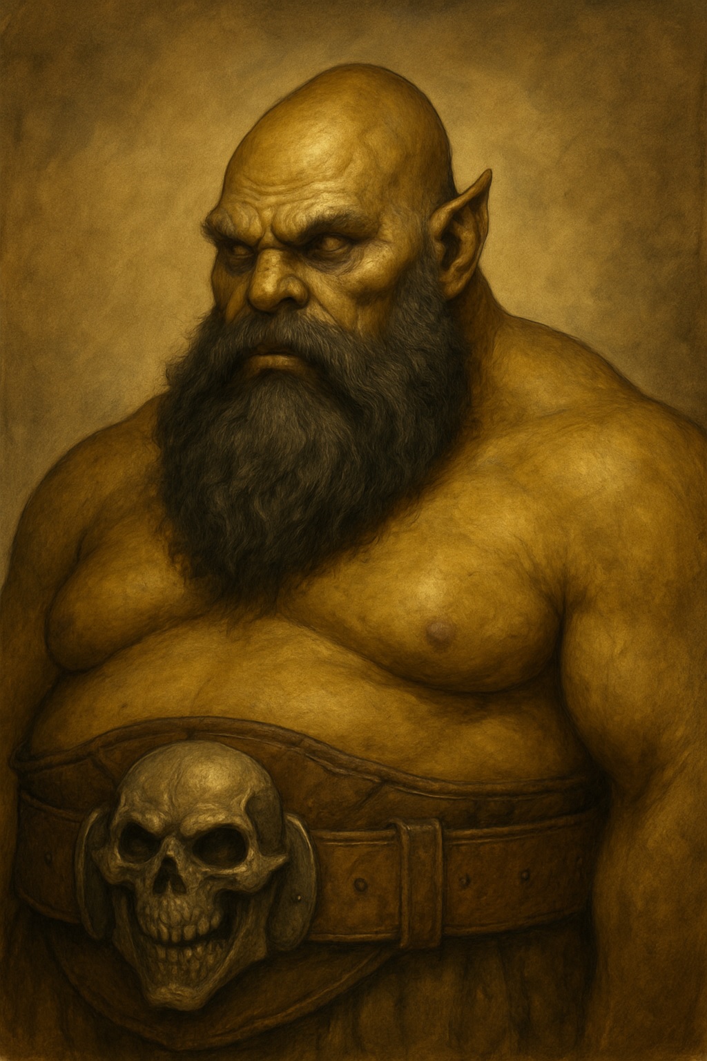 Montagne de graisse et de muscles, Tirbos est un Dolmate presque aussi large que haut, ne mesurant « que » 2 m 40. Chauve, il arbore une grosse barbe d’un gris sombre. Ses lourdes paupières tombent sur des yeux profondément enfoncés dans leurs petites orbites. Son oreille droite est manquante, et il n’en reste qu’un trou sombre marqué de cicatrices. Tirbos sort rarement sans sa protection ventrale en cuir épais, ornée de métal figurant un crâne ricanant. Il a toujours à portée de main une corne évidée qui lui sert de soutien auditif (même si son oreille gauche n’a rien perdu de son acuité).Personnalité