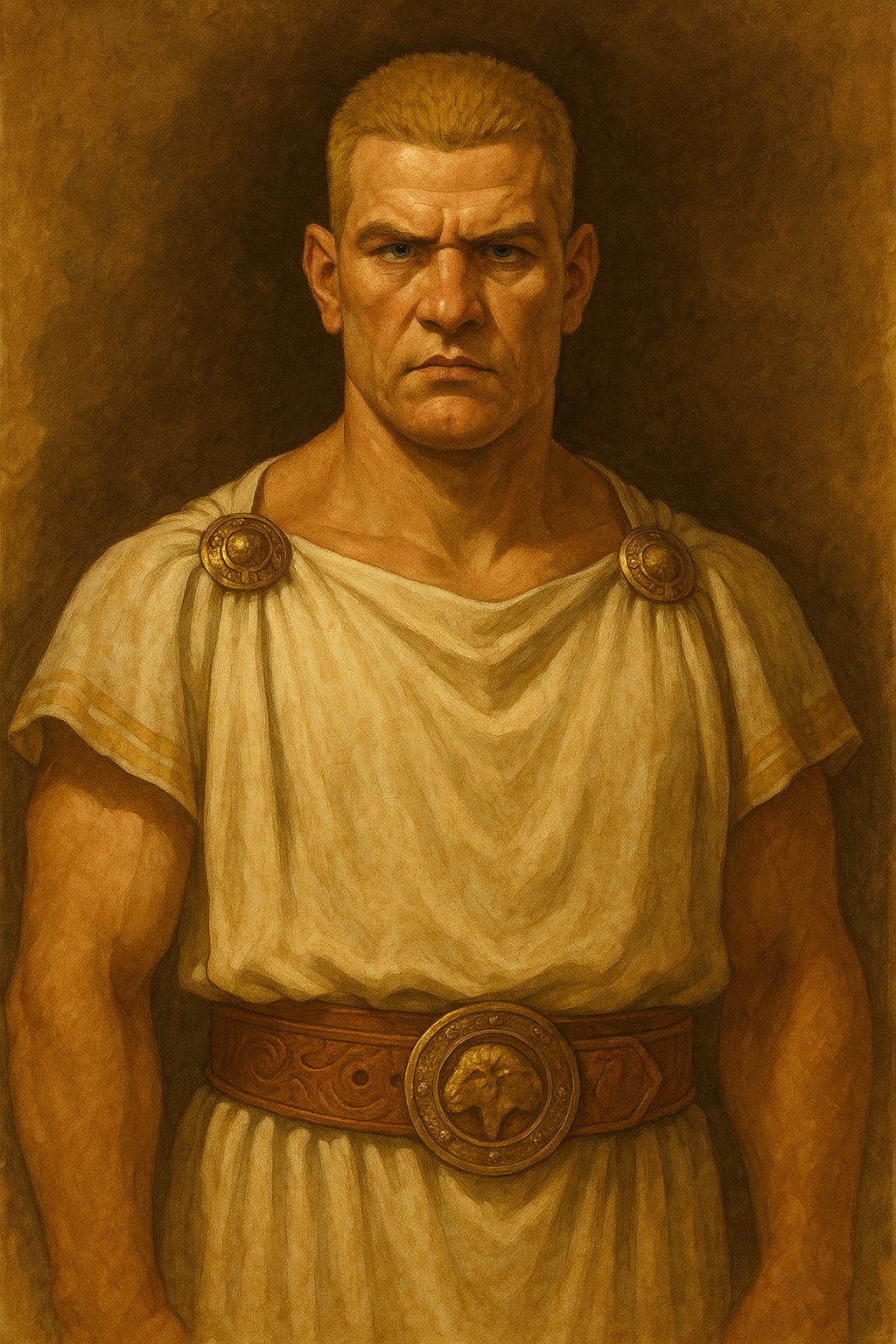 Carmunien d’une quarantaine d’années. Râblé et massif, il a un nez fort et droit, un front proéminent et d’épais cheveux blonds. Il est toujours rasé de près.