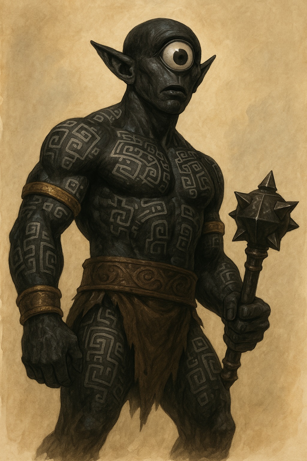 novird de près de 2 m 30, noir comme le charbon et couvert de tatouages mystiques blafards. Il manie avec un talent consommé une imposante masse d’arme.