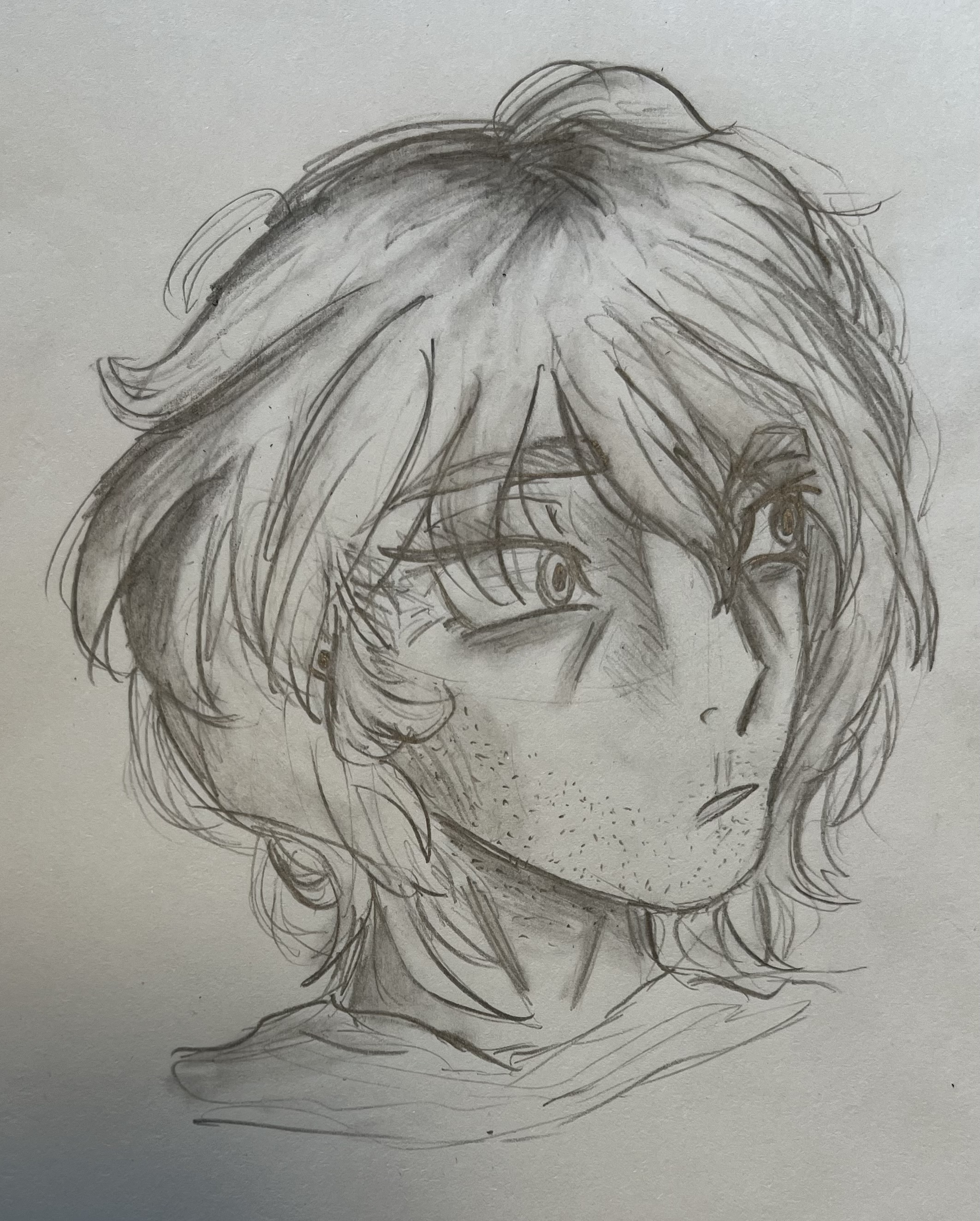 The person most often depicted in Arcade's doodles is Valér (she/they), the vice-boss (yes, that is her official title) of the falafel shop. She is the executive manager, financial manager, and a regular staff member all at once. The actual 'boss' of the shop is retired now (though Valér refuses to admit it and insists the others don't call her the boss), and Valér is her adopted child. Valér is incredibly dedicated to the shop and, though she can seem cold and intimidating, she works harder than anyone else. She, like most of the staff, is on the young side for the position they work, but they do it very well. Arcade thinks that after the years he can finally depict her grumpiness perfectly: after all, he first met her when she was only a baby.