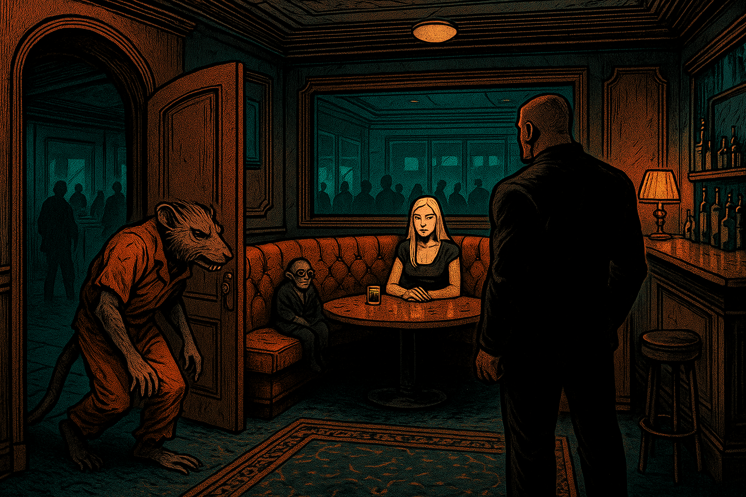 The contrast hit like vertigo. The sewers were all rust and rot - The Circle was leather, perfume, and chrome. No one had met them at the bottom of the pit, but now they were guests of honor. Cleaned, clothed, and seated in a private lounge with free drinks, they waited for their appointment with destiny. “You both got to keep your hair,” said a young man in a hoodie, rubbing the back of his neck. His skin gleamed faintly under the low light, smooth and gray like wet clay. “I woke up choking on mine. Guess I can skip the barber now.” “Is this a joke to you?” The man across from him didn’t smile, his face half-wrapped in bandages, collar drawn high. “Your power doesn’t kill people.” His eyes kept darting toward the speakers, wincing at every ringtone and fragment of static. “Let’s all take a breath,” said the woman between them. Her tone was calm, professional - until her body rippled like a disturbed reflection. Within seconds she was the spitting image of Dr. Phil in a women’s pantsuit, voice identical to the celebrity’s. “He’s using humor to manage trauma, and you’re reacting from a place of—” The gray-skinned man doubled over laughing. “That is fucking -incredible-.” Around the lounge, other survivors chuckled. Even the tense one had to look away to stifle a grin. “Oh, for the love of—” She sputtered in the TV host’s voice, hands on her hips. “I can’t control these damn changes! She’d better actually help us like they said.” With a groan she looked impatiently to the closed double doors. “You think she’s got a cure?” the larger man beside her asked. He had the kind of sadness that sat heavy on the shoulders, like he’d carried too much for too long and the weight was finally suffocating him. The gray man flicked a finger toward another table, where a creature that might once have been human twitched under a trench coat. “You think he chose to be a rat-man? Or Christ - could it be a rat-GIRL?” He squinted and leaned forward to get a better look. The shapeshifter folded her hands beneath her chin, taking advantage of the form she now found herself in. “Would you still be attracted to them if they turned out female - given your current... situation?” He looked down at his mottled skin, managed a grin. “Guess beggars can’t be choosers. Hey any chance you can work Salma Hayek into your lineup next?” A new voice broke the laughter; low, resonant, authoritative. “The Seer is ready for you.” The man who spoke looked carved from stone, his tailored suit straining at the seams. The three survivors traded glances, their brief normalcy dissolving. Then they followed without another word. Walking toward their fate and whatever answers waited behind the double doors.