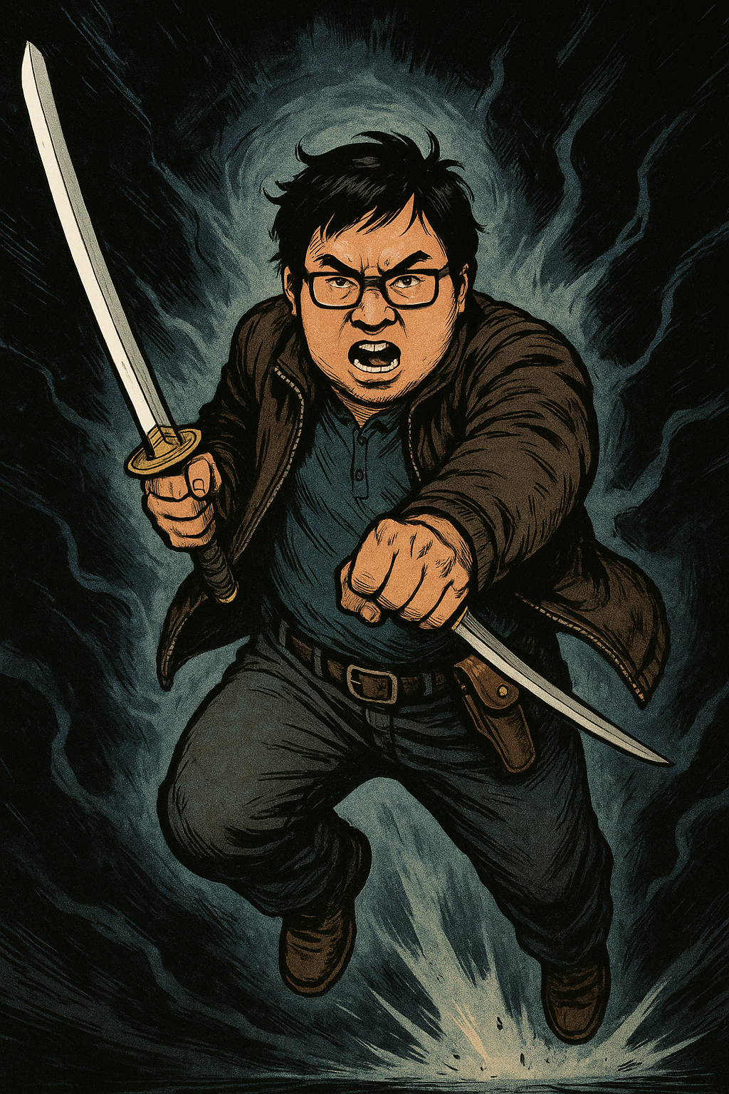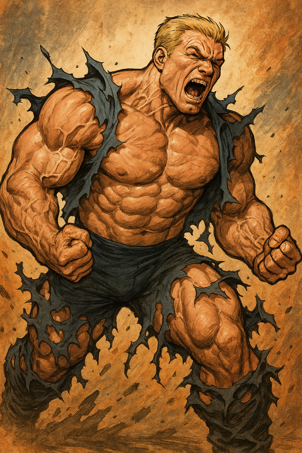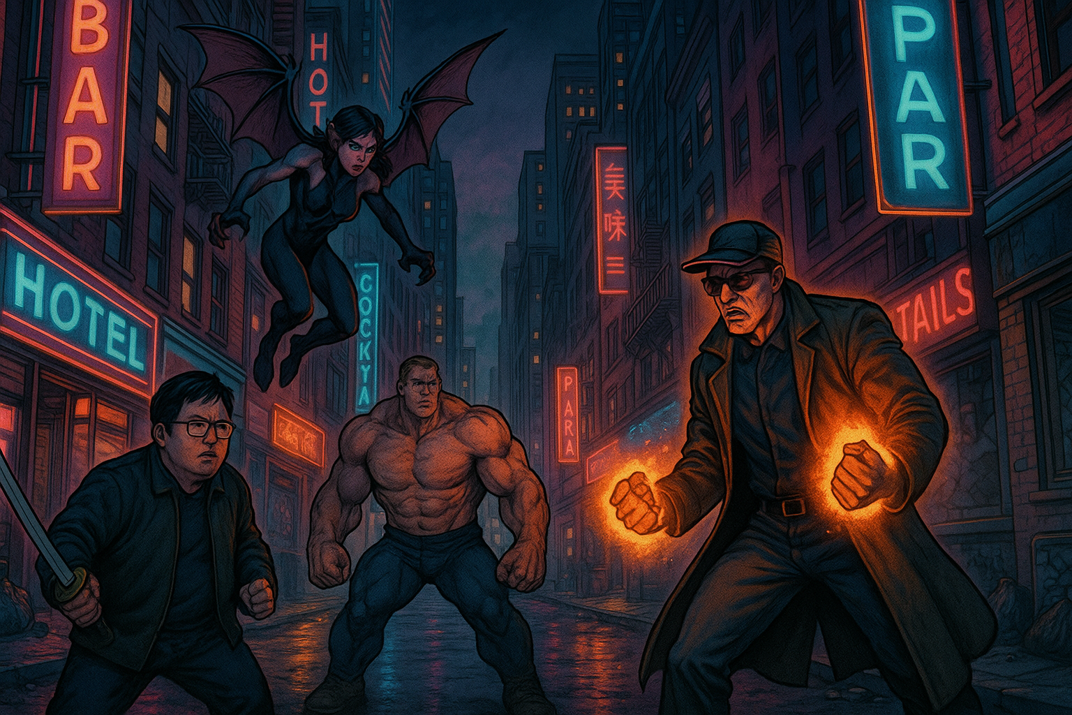 In the blink of an eye, Switch was above the man in the trench coat, the folded steel of his ancient katana falling with killing force. Alias ran distraction, aloft on nightmarish wings, claws glinting sharp enough to slice bone. Nearby glass shuddered under Apoc’s war cry - his feet pounding across the macadam as his body doubled in size, the outer layers of clothing tearing away to reveal the faded colors of his old costume. Without expression, the man who called himself Harvest countered. With inhuman speed he slipped past the descending blade, meeting Switch’s eyes for half a breath before catching the sword in a vice-like grip and flinging him aside casually. Alias dove to catch him just as Apoc made his move. His fists swung so hard they harmonized the air in a low vibrating hum, yet Harvest skipped between them like a puppet on invisible strings. “He’s goading us, seeing what we can do- we need a plan fast!” Alias gasped, helping Switch to his feet. Switch glared toward the blur ahead, then down at his blade. “I don’t think we can hurt him.” His gaze swept the street, fixing on a laundromat sign flickering in the dark. “We need to get creative.” The stalemate dragged on, each heavy swing landing on nothing but cold air. Frustrated, Apoc barked, “Fast little bugger, aren't ya'?? Dodge this!!” He pushed his power to the edge, growing again, muscle rolling over bone until he towered above the other man. His palms slammed together in a deadly thunderclap, sending a shockwave through the other man so strong it tore off his ballcap and sent him reeling. In a flash, Switch was there with a dry-cleaning bag in hand. He wrapped the zipper tight across Harvest’s neck like a garrote, doubling the plastic over and smothering him without mercy. “Choke him out!!” he shouted- though his team was already on the move. Alias swooped in, limbs melting into large tentacles she used to constrict the struggling man. Encircling and entangling, she held fast as Apoc wrapped his own bulk around her and Switch, the trio hugging and gripping with all their strength to end the fight. For a heartbeat, it felt finished. Like a calculated response, a wave of electricity passed through Harvest and caused involuntary spasms in their muscles. It was hardest on Apoc, whose eyes rolled back in his head as he flopped around the street like a fish. Alias was forced back into her human form, while Switch was left clawing burning plastic off his hands. Before anyone could recover, Harvest was rising above them, eyes and fists pulsing with condensed energy. “Run - just run!” Alias screamed, stumbling for cover. Switch collected himself enough to teleport away, leaving behind the smell of ozone and burnt cloth in his wake. Apoc was still reeling and could only look up as the figure approached him, speaking for the first time since their meeting. The man known as Harvest tilted his head slightly, voice calm, almost polite. “You're carried the burden of power long enough. Let me ease your responsibilities...”