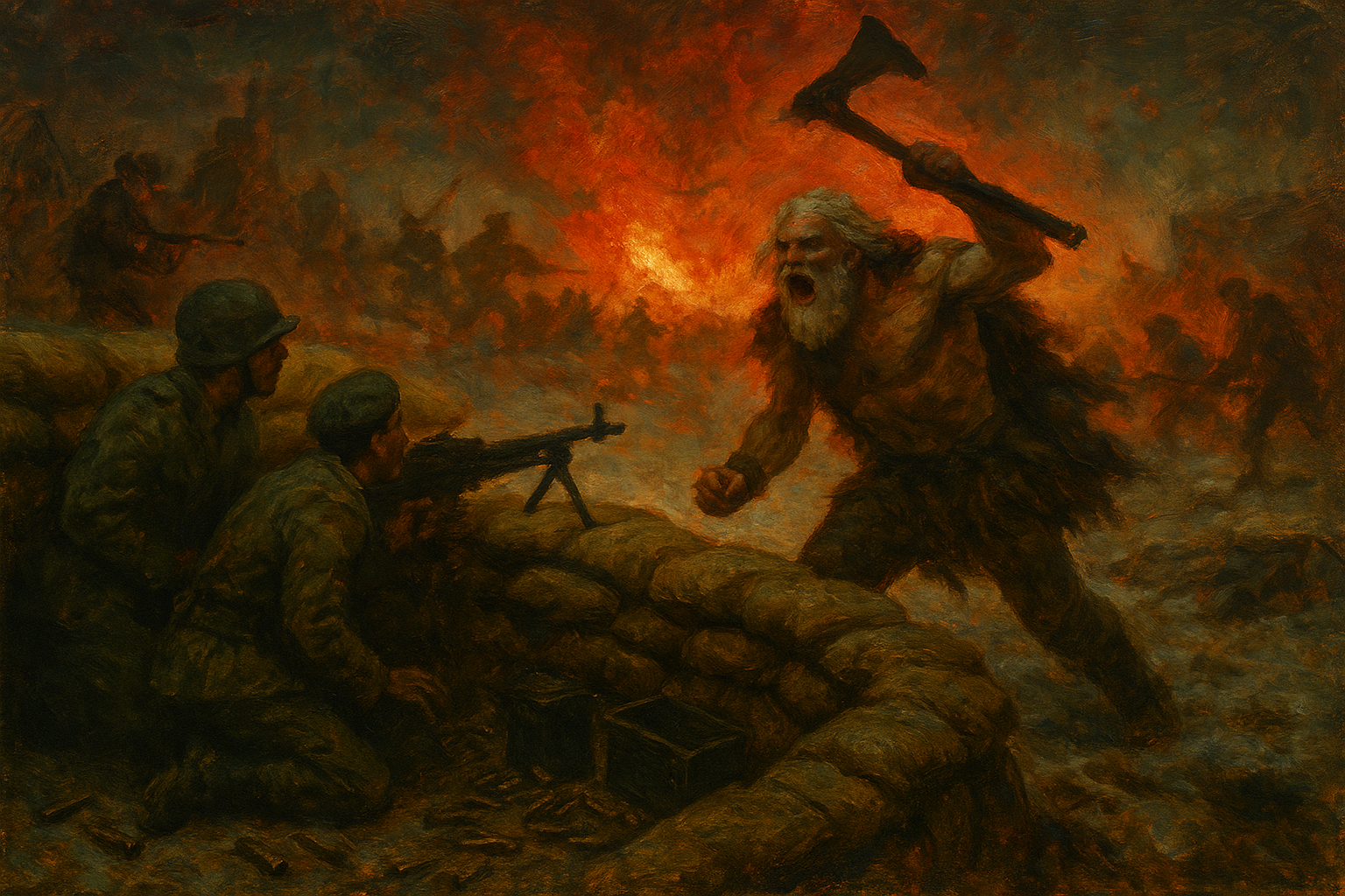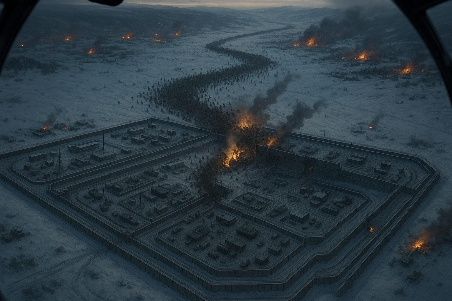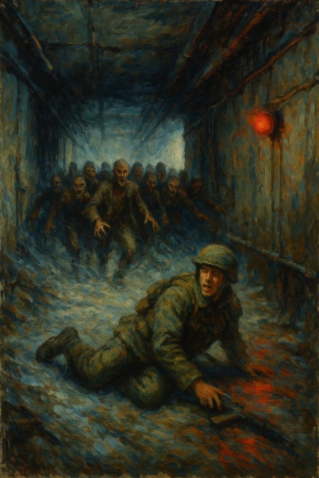 They held for three days with a simple discipline- fire, reload, repeat. Speaking only to pass ammunition down the trench, the foxholes turned into little museums of desperation. Frozen piles of spent brass, bloodied dressings, and a stink that the cold couldn’t quite bury. Men were so scared to move once they were posted, most never did. By the third morning the valley felt picked clean of quiet. There was no wind, only a gale force howl, screaming and gunfire as much a constant as insects buzzing on a summer day. The Armistice told themselves the Yukon were almost spent. They rehearsed that lie between clenched teeth, refusing to see the line of reinforcements that stretched into the horizon. The breach came like an answer to that lie. The siege broke as suddenly as it had began. An abomination, some kind of cross between man and beast, tore a hole in the fortifications. It hit the west wall where the concrete had cracked in a star pattern since the first barrage. There was no ladder, no bomb-sled, no elegant machine of war - just something heavy and deliberate, shouldering the seam again and again until the star finally ran out of lines and became a hole. The first group through the tear didn’t last the length of a breath. The defensive batteries opened up, too close for comfort but close enough for certainty. The blasts didn’t so much break bodies as erase them into air and grit. The certainty came at a cost. A second hole fell in, then a third, and now the neat geometry of defense broke like old plaster. The cannibal army was here, and there was no place to retreat. The Yukon soldiers were rumored to be starved during a siege, and the rumors seemed true. Some came over the wall only to drag screaming soldiers back with them, some didn't even wait that long. Eating parts of their victims raw in the midst of the intense fighting. A few broke just from witnessing the brutality. With the last remnant of morale gone, the fort had truly fallen. The night became a theater for desperate last stands and heroic sacrifices. Some tried to flee into the tree line, some hid in the base. As more and more of the cannibal horde moved in all hope of escape vanished. Some smaller fortifications held, creating whole new meat grinders as survivors tried to make these last bastions of cover before being run down. A long night of horrors lay ahead. If they could survive until dawn they had one last chance to get out of this madness. Air support from their allies was coming at first light, the kind that would turn the fate of this war once and for all.