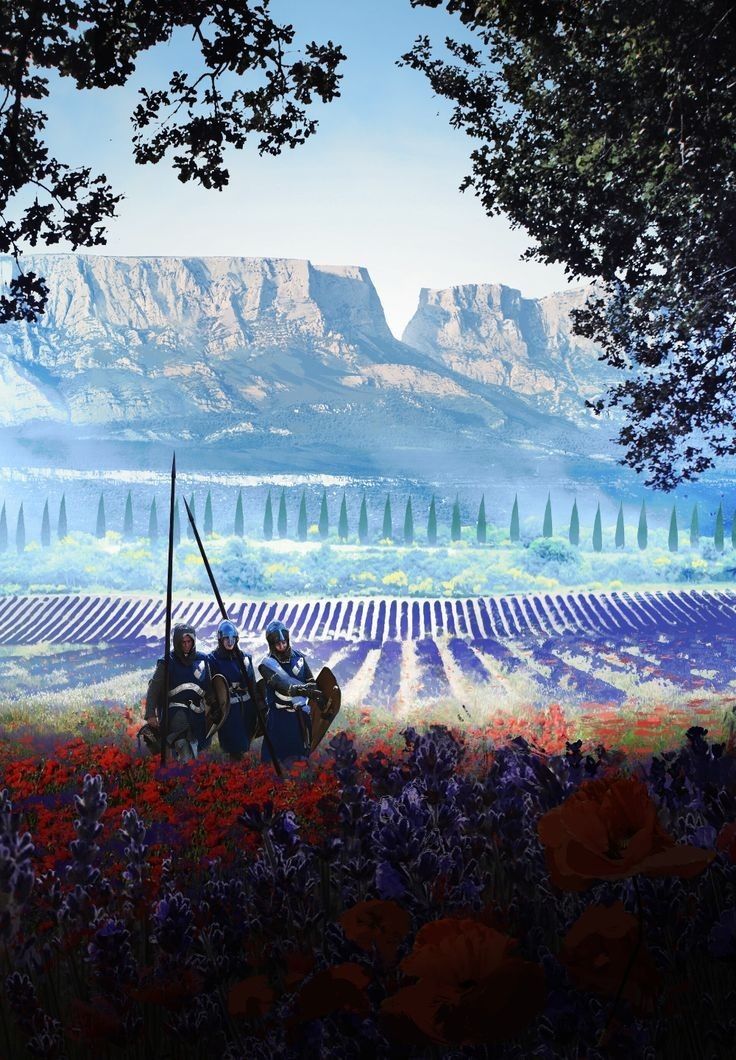 ne hundred and seven gliterring waterfalls adorn the cliffs of the stunning valley in which Dol Gadmen, "The Shimmering City" is located. Shafts of rainbow light reflect off the walls of water surrounding the city, illuminating the beautiful autumnal beech and alder trees that are locked in a perpetual state of 'fall'; leaves of yellow, orange and red forever falling on the cobbled pavements, from an enchantment cast by an overzealous wizard decades ago. Spacious estates dominate this city's architecture, in which reside the 'intellectual elite' of the Empire. Marvellous gardens fill the area around a family's manor, some so large as to accomodate hundreds of citizens. Overlooking the city is a great monument to The Astronomer, who looks over the city providing guidance, inspiration and clarity to those in his shadow. The Spell Thief is also highly revered within Dol Gadmen, as a keeper of knowledge and a finder of secrets. The area surrounding the monument is known as 'the topway' - a small congolmerate of buildings that serve as the first point of contact for travellers entering the city from the North. In the shadow of the northern cliffs and the Astronomer lies 'Lower Gadmen' a collection of smaller buildings crammed between the luxury estates and the cliff-face. Here live the unaffiliated - refugees, those without work or travellers who are not sponsored by one of the houses of this city. At the centre of Dol Gadmen lies The Aviary, a large dome of glass which surrounds an old stone tower. Magical imagery is projected onto the glass, casting light shafts and rainbows in every direction. Birds flutter around the inside of the dome, in beautiful bright colours of every shade and combination you can imagine. It is here where members of the Conclave of the Fifth treat with oneanother. The city has a vibrant yet dangerous and chaotic feel. The members of the Conclave who live here are the most powerful mages of the Empire, and behind their stunning appearances and charming smiles are dangerous ambitions and a self indulgent culture. Power in the city is ceded to the High Steward of the Conclave, an elected official that is usually the most powerful wizard from a noble line of the Empire. The current High Steward, the revered Ser Archimedazaen III, is a reclusive old wizard who spent his youth travelling as a Knight of the Eclipse against the monsters of this world and later settled in the Shimmering City to live out his years lecturing to the youth of the Conclave on this subject. Parties and magical anomalies are common in the city, as magical practitioners develop their enchantments and life's work. Events are always happening within each estate in the city, and opportunity is rife for those who stay informed. Viticulture dominates the valleys at the northern end of the Dancing River, making it the primary trade export of the city. Horses and Rondo from the Steppe, oxen and bone from the Freemen of the far north and jems from the western foothills are all huge commodities of the region. Pictured: The lands around Dol Gadmen