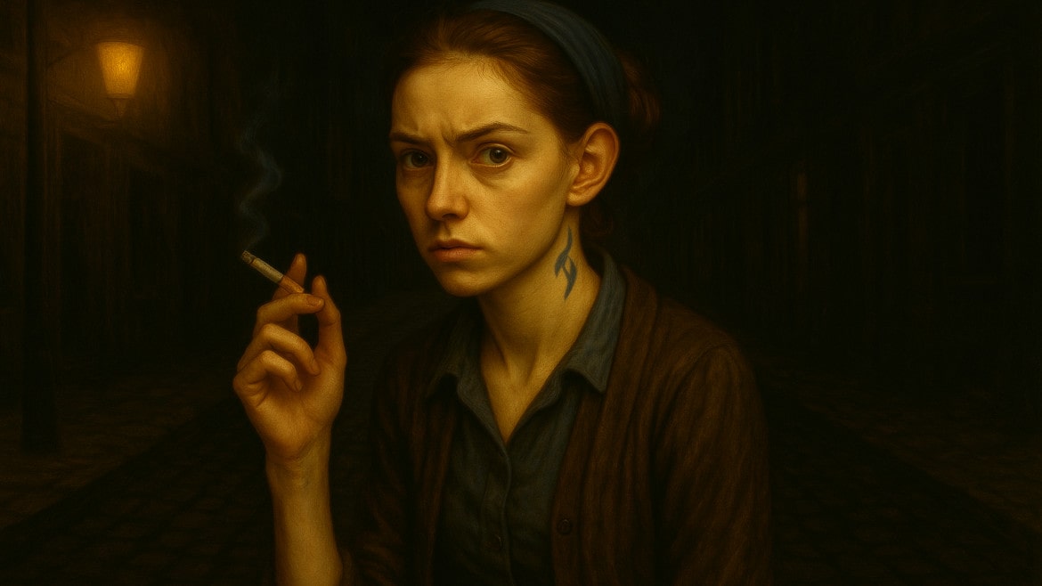 Marta is lean, pale, and fox-faced, with sharp cheekbones and sharper eyes. She dresses like a city clerk on the edge of a breakdown—muted skirts, worn cardigans, and a cigarette always half-smoked between her fingers. Her voice is low and deliberate, her words clipped and heavy. A cracked leather ledger rarely leaves her side; inside, she records every slight, death, and debt in looping, blood-red ink. The crook of her neck bears an old Crooked Horn tattoo, nearly scrubbed off—but still faintly visible.Personality