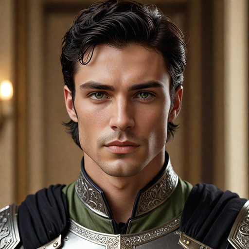 Beau is a strikingly handsome man with a chiseled jawline and tousled, raven-black hair that falls just below his ears. His skin is fair, and his sharp, green eyes are always carefully maintained to project confidence and allure. He takes great pride in his appearance, keeping his armor polished to a near mirror-like shine and his clothes impeccably tailored. Beau's face is clean-shaven, his features symmetrical and flawless, giving him a regal yet approachable air. Despite the hardships of his past, Beau remains fastidious about his grooming, maintaining an aura of grace and elegance even in the roughest of circumstances.Personality