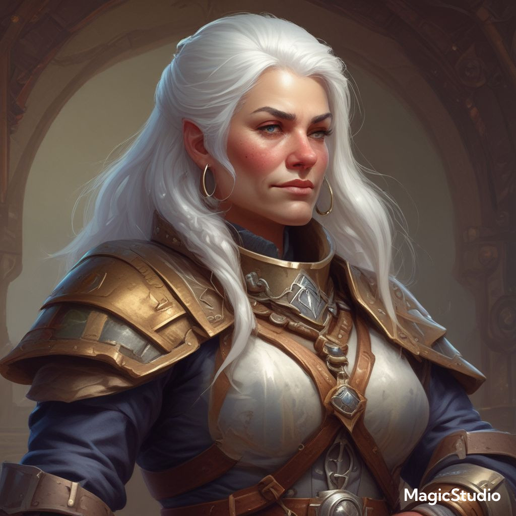 Dagna is short and stocky, with a weathered, stone-like face etched with deep wrinkles. Her once red hair is now a stark white, always kept in long, tightly braided strands that reach her waist. Her eyes are a piercing, unsettling gray, with an intensity that unnerves those who meet her gaze. She dresses in dark, tattered robes adorned with grim symbols of death, including a necklace made from tiny carved skulls. Dagna’s hands are heavily calloused, and her voice is rough, like gravel scraping stone.