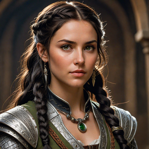 Lorena "Low" Hawthorne is a weathered woman with sun-touched skin and long, dark hair often tied back in a tight braid. She’s lean, with sharp, angular features, and her piercing green eyes give her an intense, calculating look. Lorena is usually clad in a dark, heavy coat worn over chainmail, lending her an imposing presence. She moves with a steady, confident grace, the kind born from a life on the edge of danger.Personality