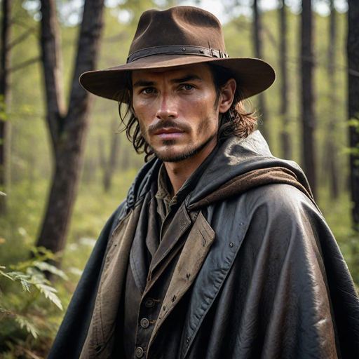 Rowan is a rugged, gaunt man in his late twenties, but years of isolation and hardship have aged him beyond his years. His once dark hair has streaks of premature gray, and a constant shadow of stubble covers his sharp jaw. His eyes are always darting around as if expecting something to emerge from the shadows, and his hands are calloused from years of working the land and hunting. Rowan wears simple, practical clothing: a long, worn leather coat, a wide-brimmed hat that hides his eyes in shadow, and a patchwork cloak that blends him into the wilderness. His crossbow and quiver are always within arm’s reach, and his boots are caked in mud and dirt from his endless wandering.