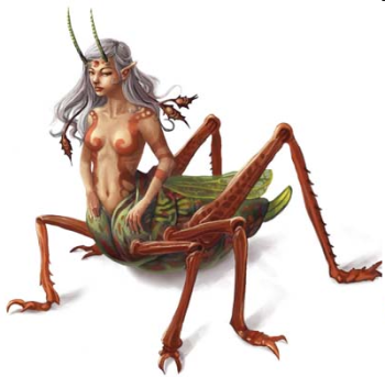 Grigs are small, cricket-like fey, standing at about a foot tall. Their bodies are slender and agile, covered in a fine layer of green or brown scales that blend seamlessly with their woodland surroundings. They have elongated limbs that end in nimble fingers and toes, perfect for playing their enchanted fiddles. Grigs possess large, multifaceted eyes that shimmer in the light, and their faces are often adorned with mischievous grins.Their wings, resembling those of a dragonfly, are translucent and iridescent, capable of producing a soft, humming sound when they fly. Grigs have antennae that twitch with every movement, and their grasshopper-like legs allow them to leap great distances with ease. They typically wear garments made from leaves, bark, and other natural materials, which provide both camouflage and comfort in their forest homes.
