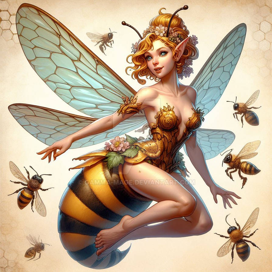 Melixies are diminutive, bee-like fey, no larger than a honeybee. Their bodies are covered in soft, golden hair, and their wings are translucent with a delicate, rainbow sheen. Their eyes are large and honey-colored, reflecting a gentle, nurturing nature. Melixies have delicate features, with tiny, pointed ears and sweet, cherubic faces that radiate warmth and kindness.Their attire is woven from spider silk, dewdrops, and petals, giving them an ethereal, shimmering appearance. Melixies’ hair is often styled in intricate braids or buns, adorned with tiny flowers and leaves. They exude a sweet, floral scent, and their voices are melodious and soothing, capable of calming even the most agitated creatures.