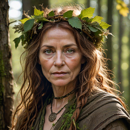 Verna has a serene yet otherworldly presence. Her chestnut hair is streaked with gray, and her deep green eyes seem to reflect the forest's mysteries. She wears weathered, homespun clothing adorned with natural trinkets like feathers, dried herbs, and carved wooden charms. Around her neck is a crescent moon pendant, a symbol of her connection to nature.