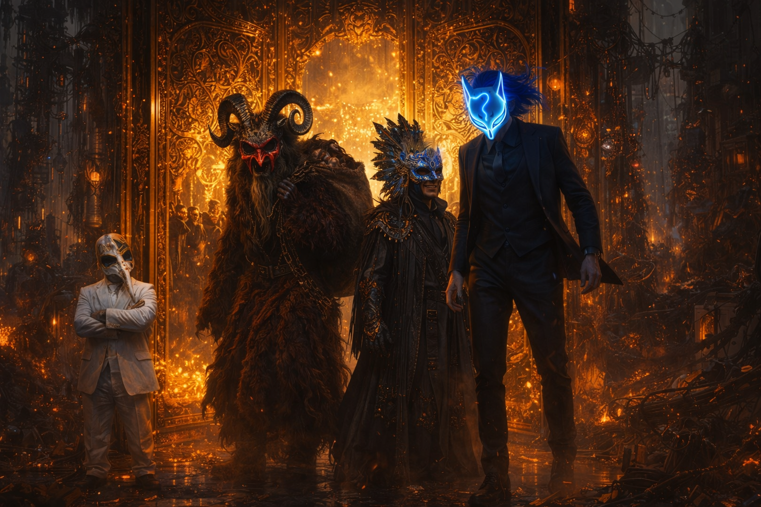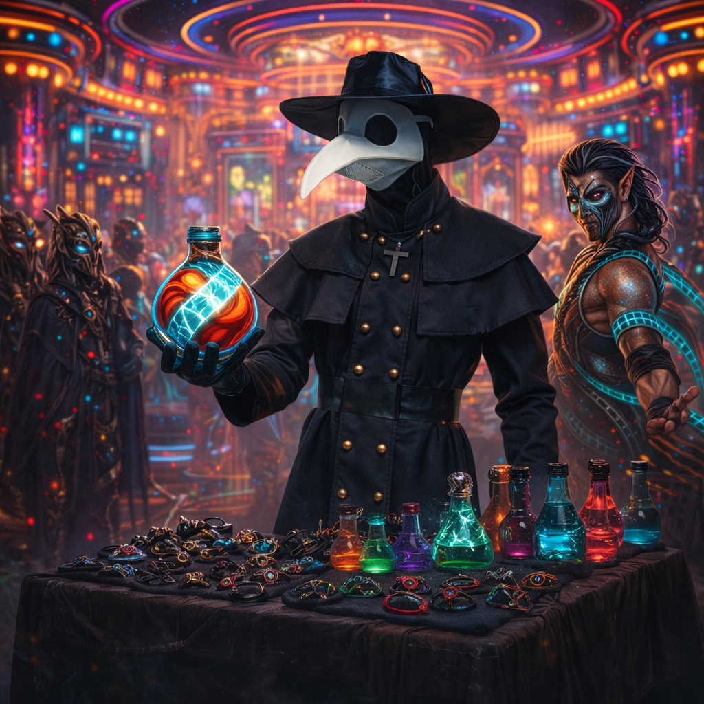 The session opened with downtime activities: Jaxon fought in the pits, Forseti immersed himself in forbidden historical research, and Liam concluded a dangerous gambling quest by defeating the Collector and claiming The Winning Heart. The party then prepared for The Radiant Masque, commissioning custom masks and costumes before entering one of Camp Hope’s most symbol-laden social events.