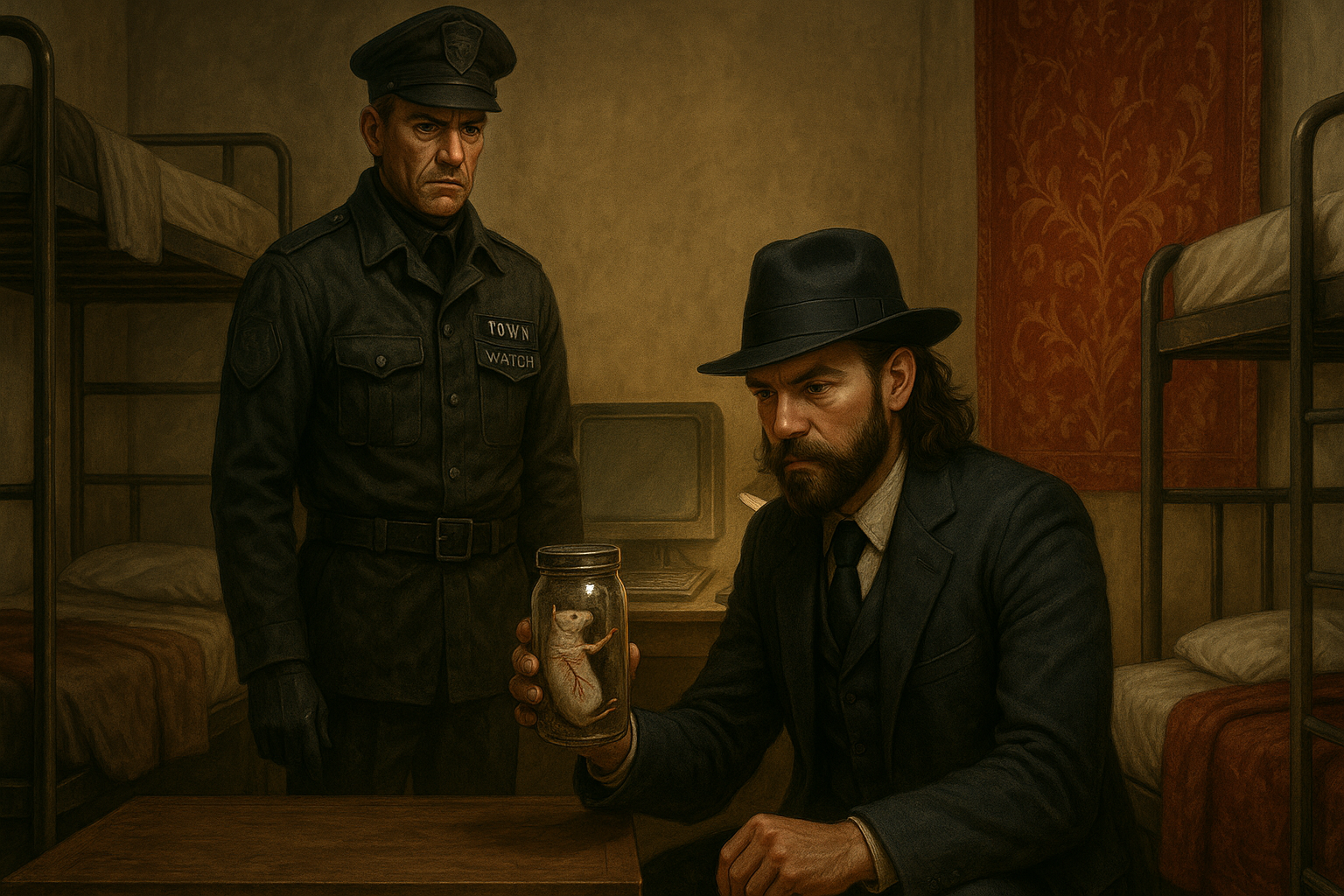 Seeking answers, Liam visited his father to discuss Vellum’s history and the growing evidence that the recent murders were tied to The Anatomy of the Eternal Vessel. His father revealed that the old surgical wing, W-9, had been decommissioned after a failed regeneration program. He also advised Liam to seek help from the Town Watch’s tracking dogs and gave him an expeditious messenger for urgent contact.