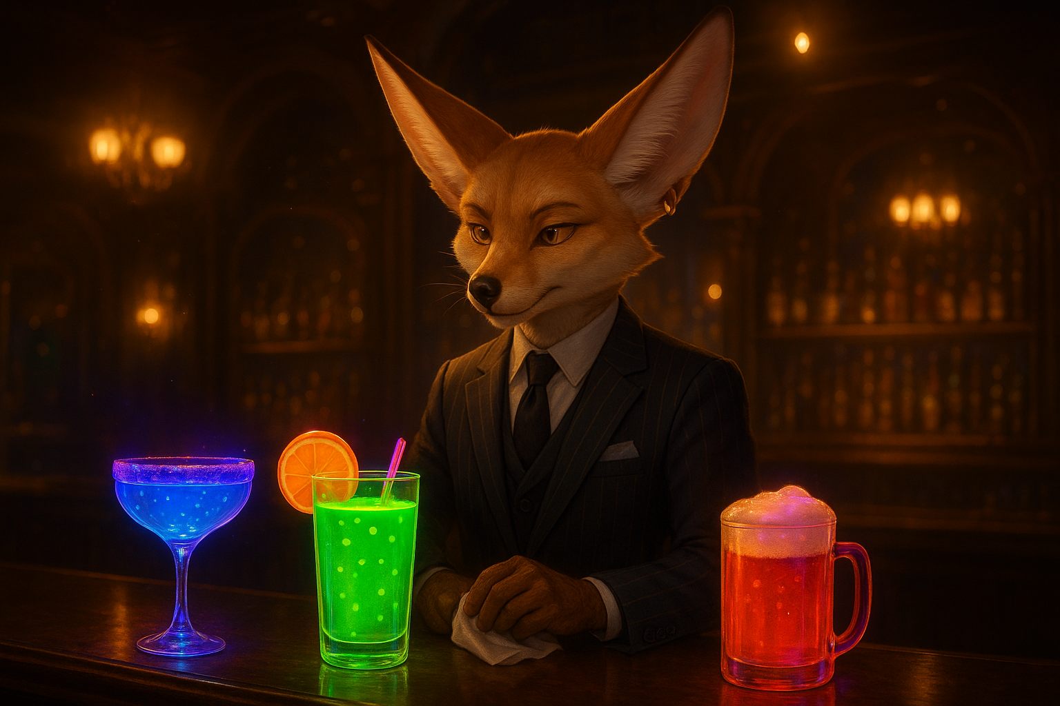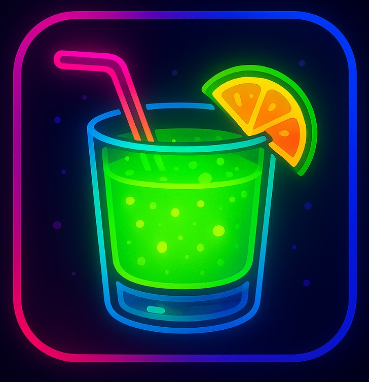 Scavenged vodka, lime, sour synth-apple, and glowing algae syrup. Luminous. Dubiously safe. A hit with risk-takers and showoffs.