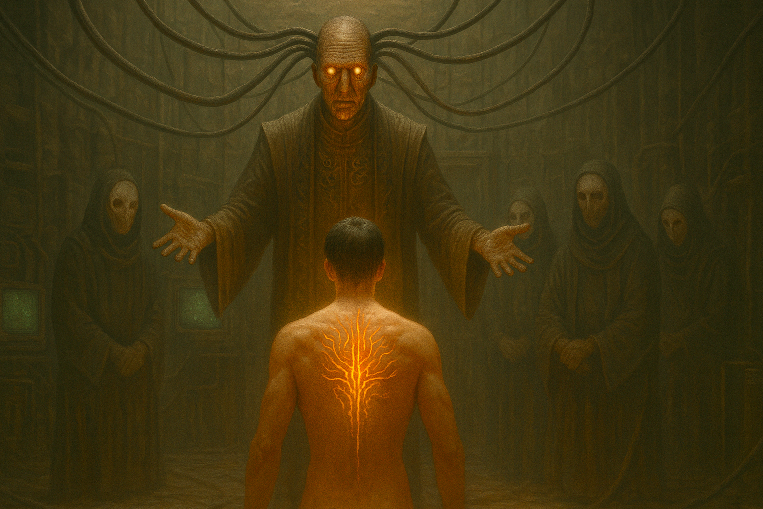 When they finally finished the mapping, the initiate’s back looked less like human flesh and more like a topographical map of some alien signal. Symbols shimmered faintly, shifting as though responding to wavelengths beyond my comprehension.