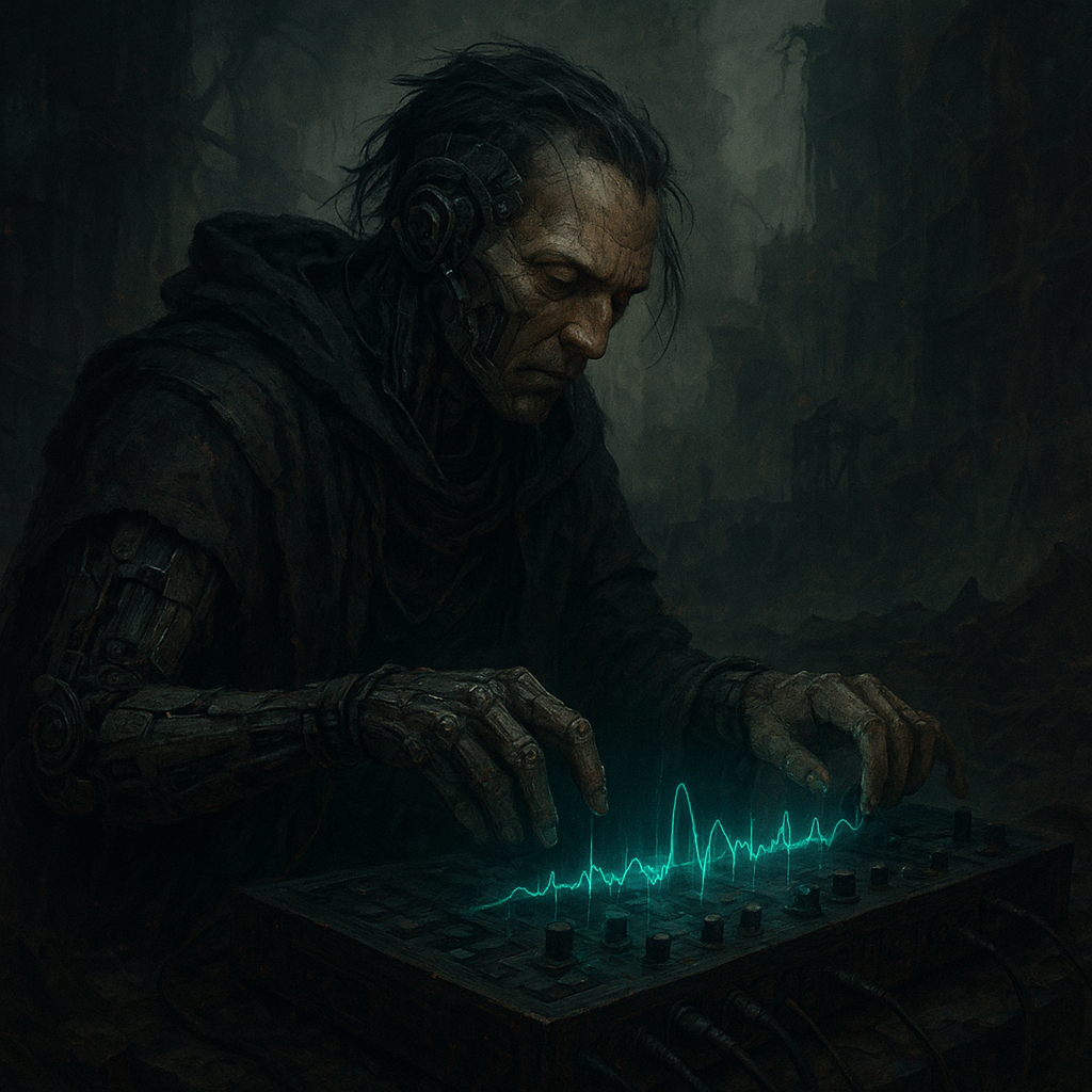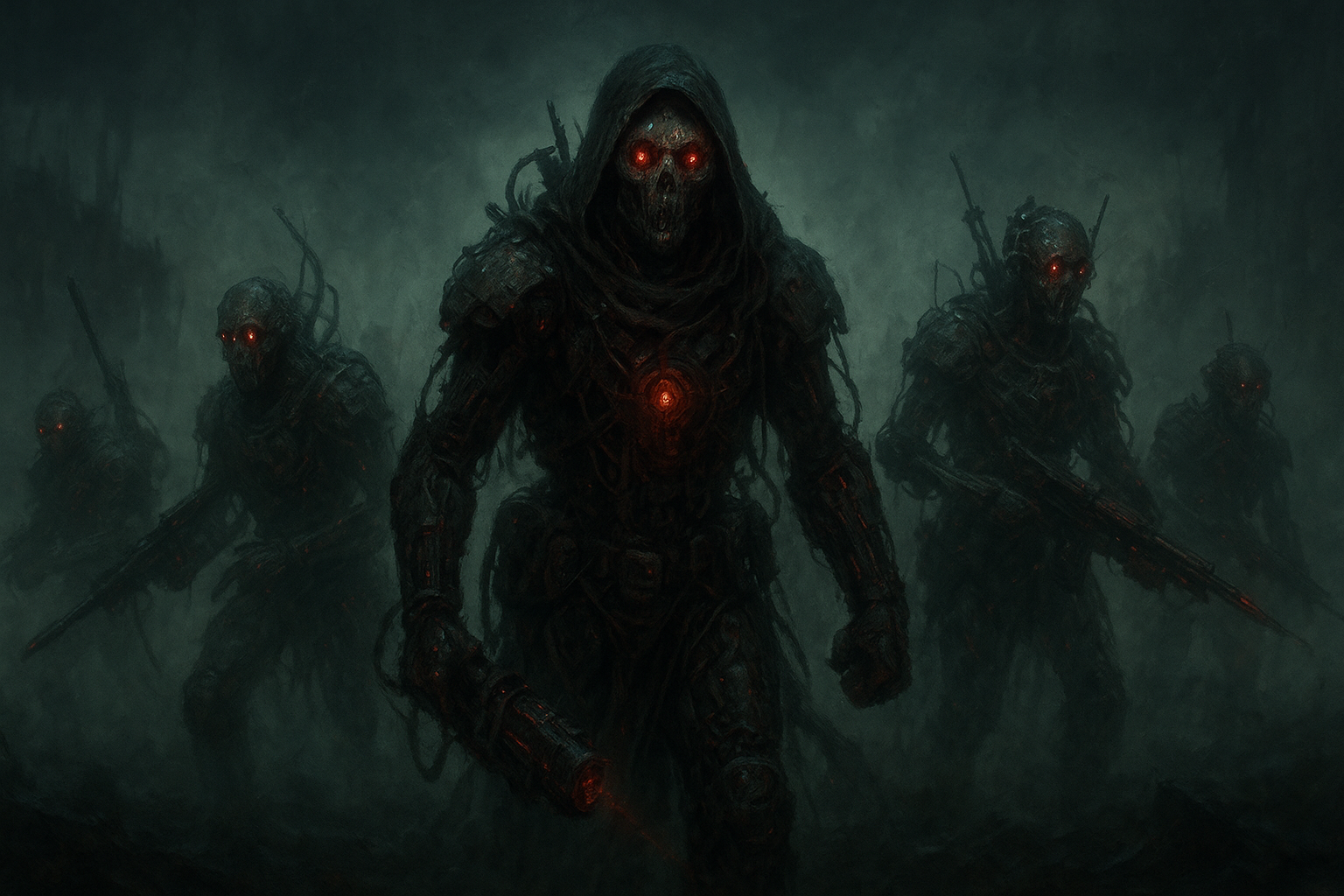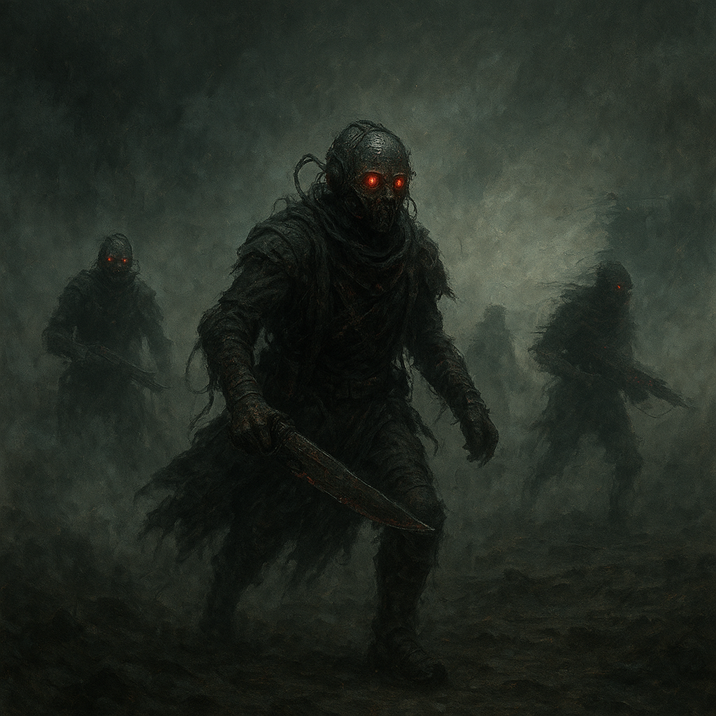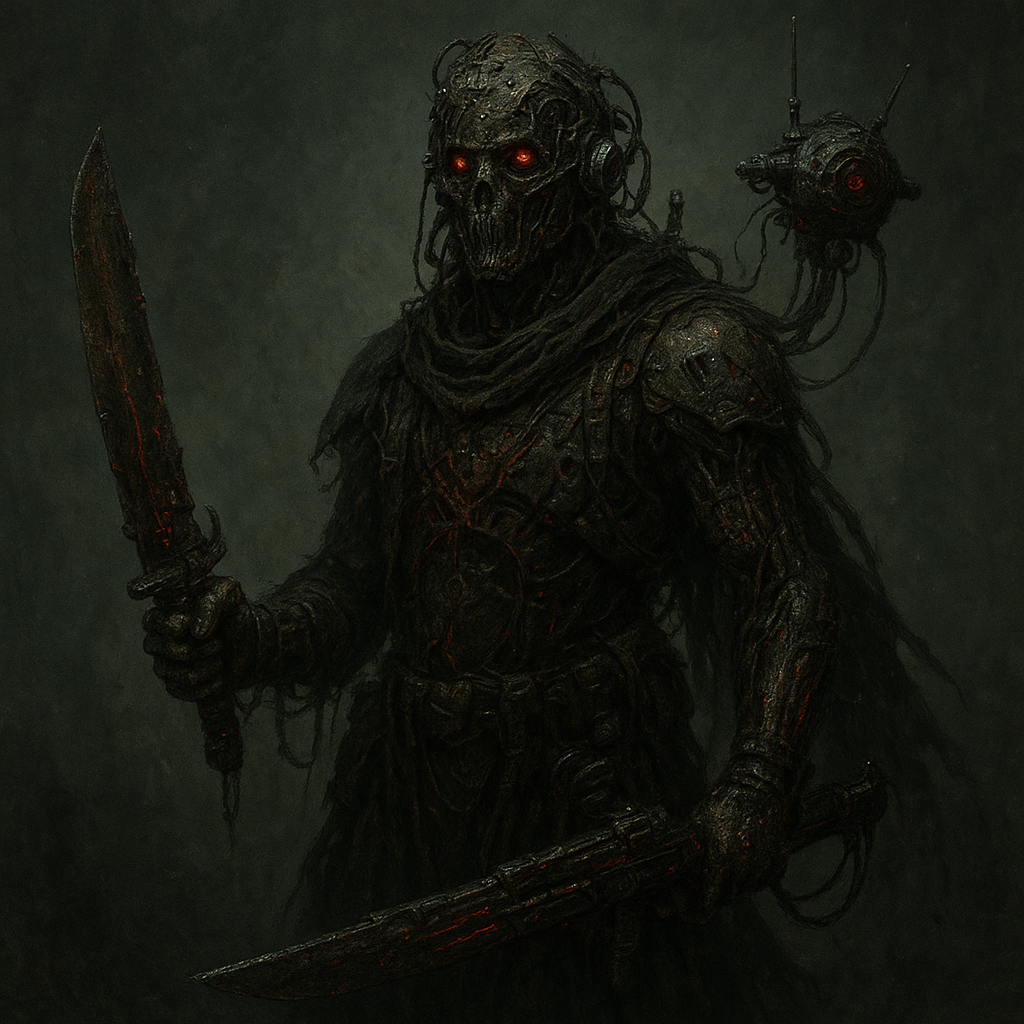 Equipment and weaponry within the Tuned Host is intensely personal, a reflection of each fighter’s body, mind, and devotion to the Signal rather than a standard issue. Some carry Rustcleavers (pre-Fall weapons fused with corrupted cores) worn and nicked like extensions of their own limbs, while others wield Bitblades, monoweapons that hum and flicker out of sync with time itself. Neural implants, antenna arrays, and subdermal filaments snake beneath exposed skin, augmenting reflexes or broadcasting the wearer’s own pulse of resonance. Drones, corrupted mortar units, or Mist-condensing devices accompany those who have mastered battlefield engineering, each tuned to respond only to their handler. Even the clothes they wear are weapons in disguise: signal-wrapped robes, ritual circuitry tattoos, and tattered exoskeletal enhancements all contribute to the aura of menace and function. Every piece is an extension of the self, chosen and modified to harmonize with the fighter’s rituals, skills, and personal communion with the Signal.