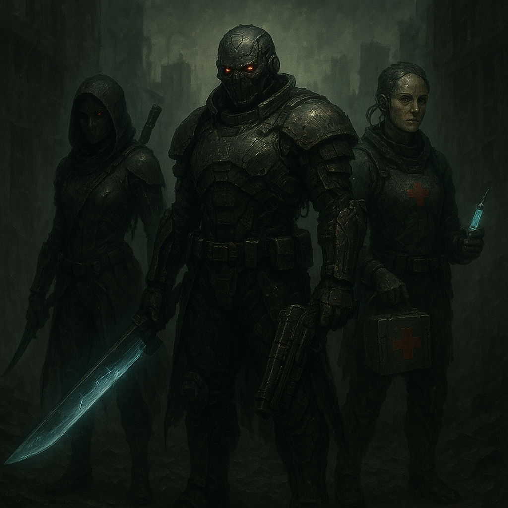 The Tuned Host organizes its warriors and operatives into Three Pillars, each reflecting a distinct combat philosophy. The Chorus of Impact are brutal frontline augments, individuals whose bodies have been hardened, spiked, or bone-forged to break shields, walls, and anything unfortunate enough to stand in their charge. The Veiled Choir comprises the ghostlike infiltrators; precision killers who slip through the world as though reality itself loses track of them, striking in eerie silence before fading again into the fog. Finally, the Resonant Order represents the stabilizing force: healers, tacticians, and specialists, who direct engagements and keep their comrades alive. In game mechanics, a character’s Pillar is determined purely by class choice, offering flavor and identity without altering rank, renown, or professional advancement within the Tuned Host.