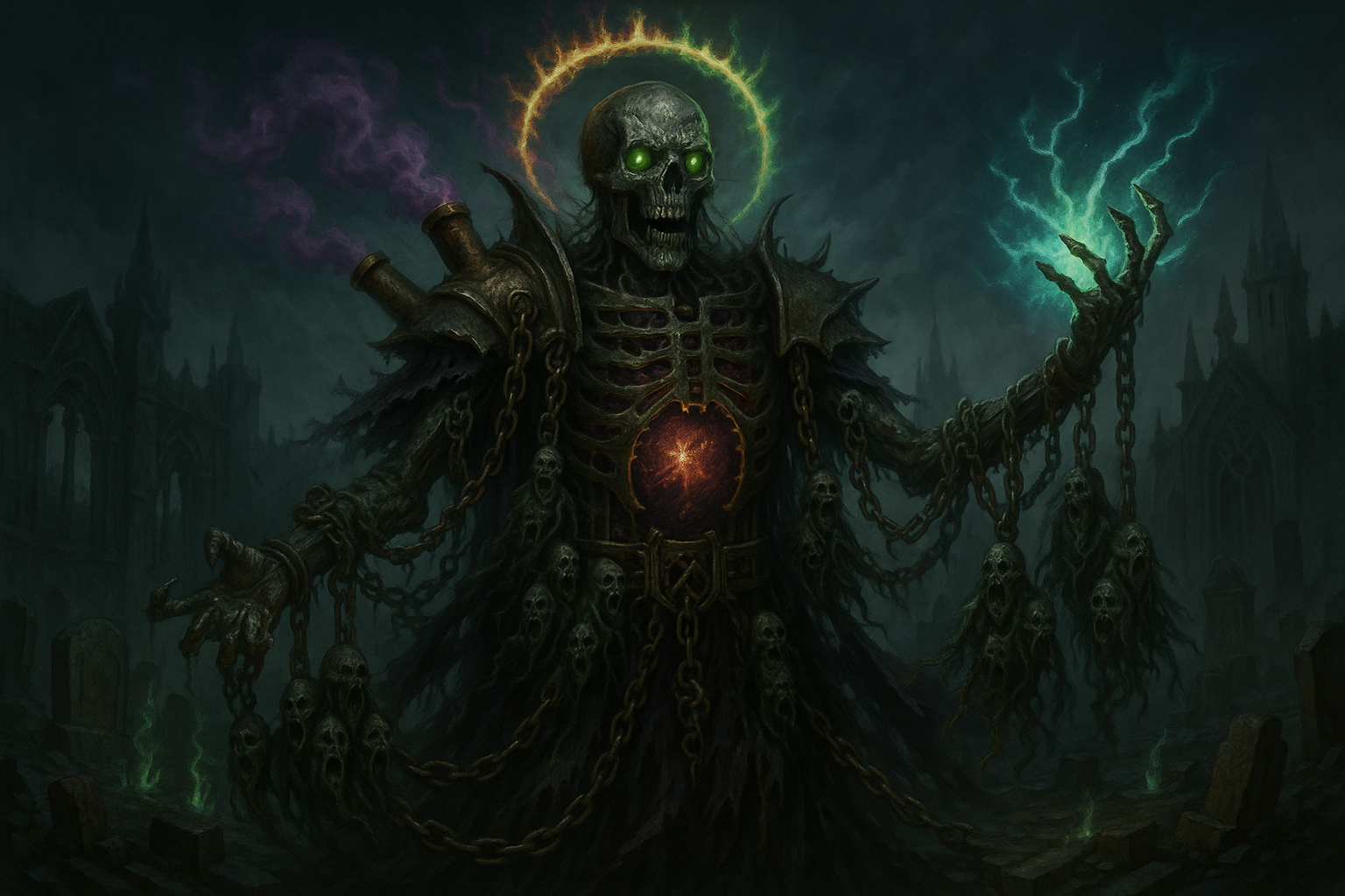 The Ashen Hierophant is no withered corpse hiding behind illusions—its form is a skeletal cathedral of flesh and iron. Pipes jut from its ribs, exhaling violet smoke; chains of screaming spirits coil around its limbs; and its skull burns with a forge-fire halo of violet and green. In its chest yawns a cavity where a heart should be, the cavity framed by runes and filled with the glow of its soulstone, pulsing like a furnace behind bars.