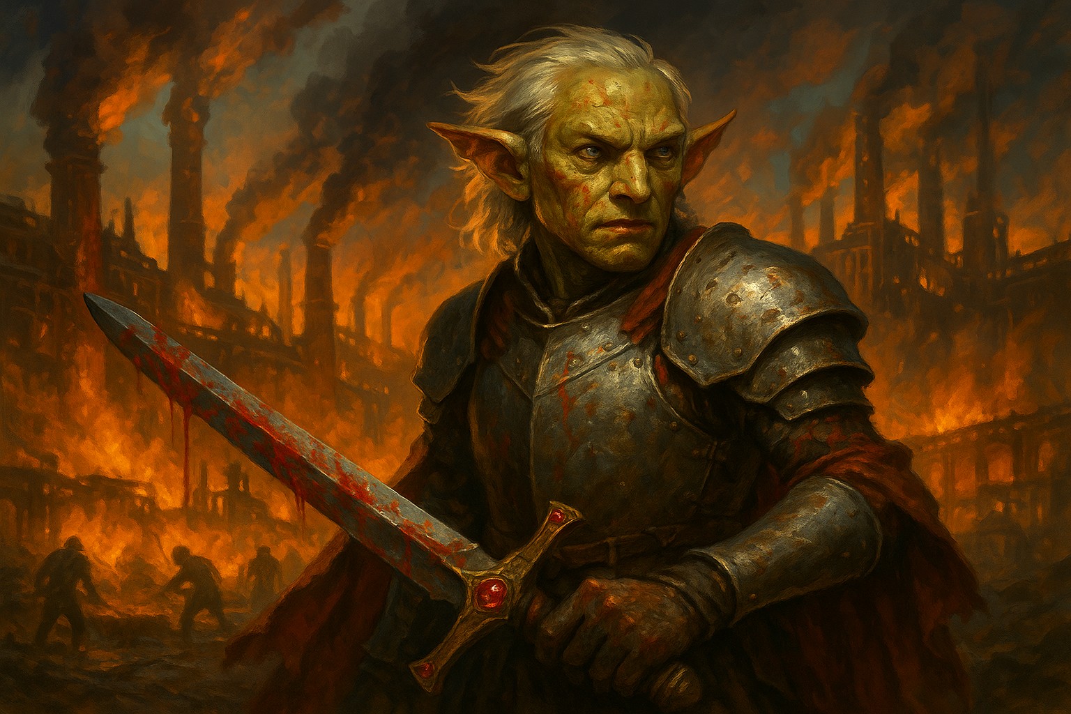 Image Generation Prompt: A scarred goblin Baron in battered half-plate armor wielding a blood-encrusted longsword with glowing red gems in its pommel. His green skin bears chemical burns and ritual scars, while his yellow eyes gleam with manic intensity. Industrial foundries burn in the background with desperate workers laboring in dangerous conditions.