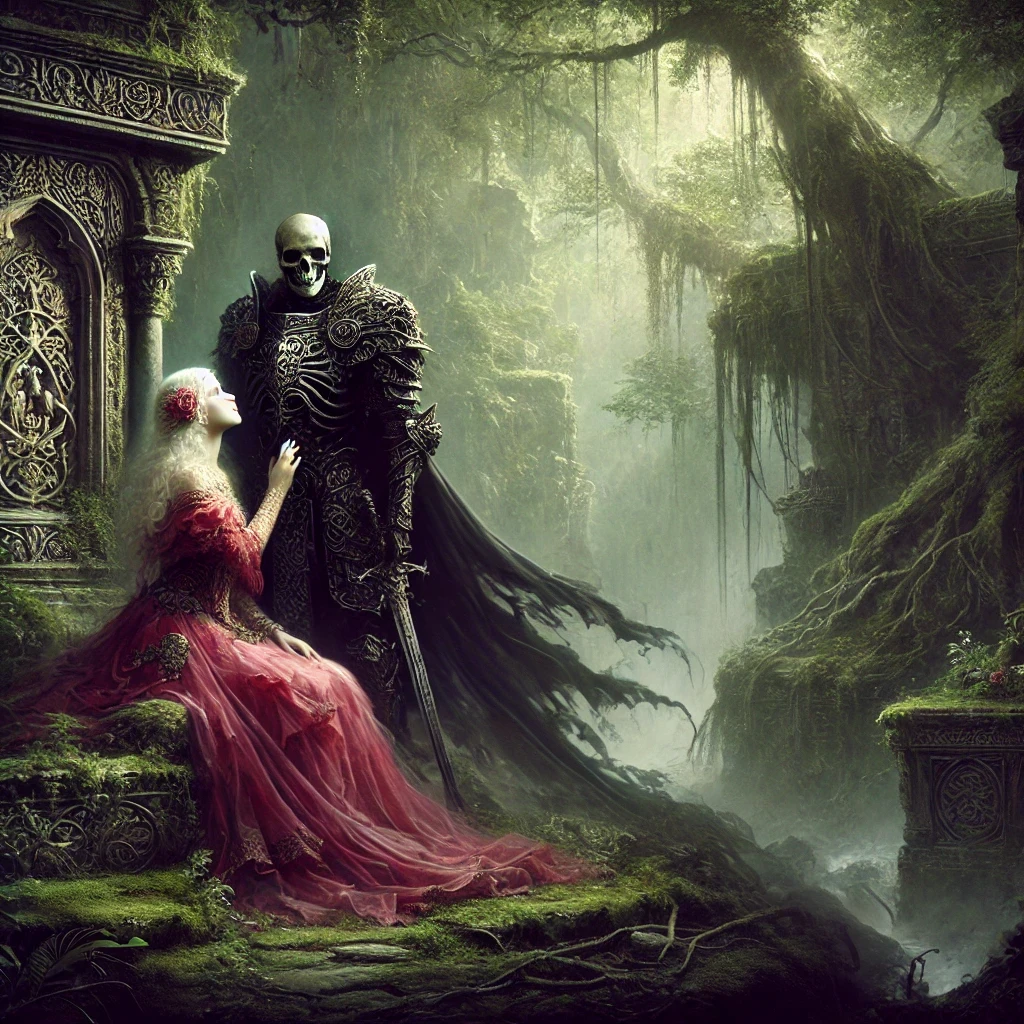 "Through corrupted groves they walk their penance, the skull-faced knight and his eternally beautiful queen. Each step seeks redemption, though the very soil rejects their attempts at healing."