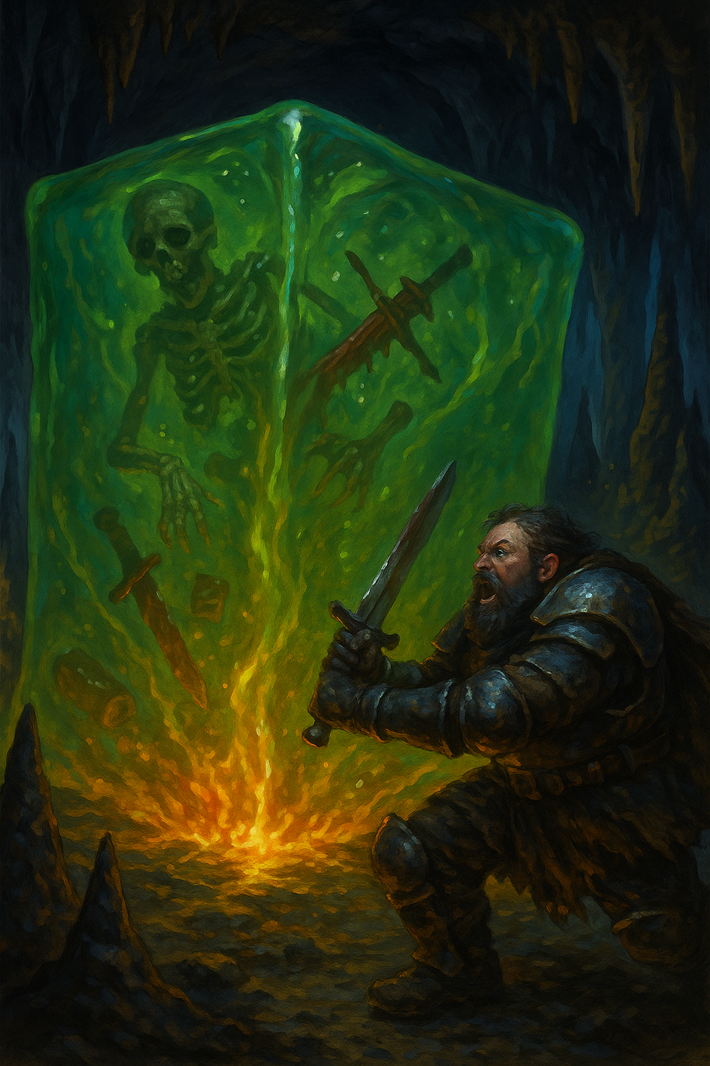 Gelatinous cubes in Grizburg are not accidents of nature—they are reflections of the city itself: silent, corrosive, patient, and inevitable. In the smog and shadow, their glow is a reminder that even light can kill.