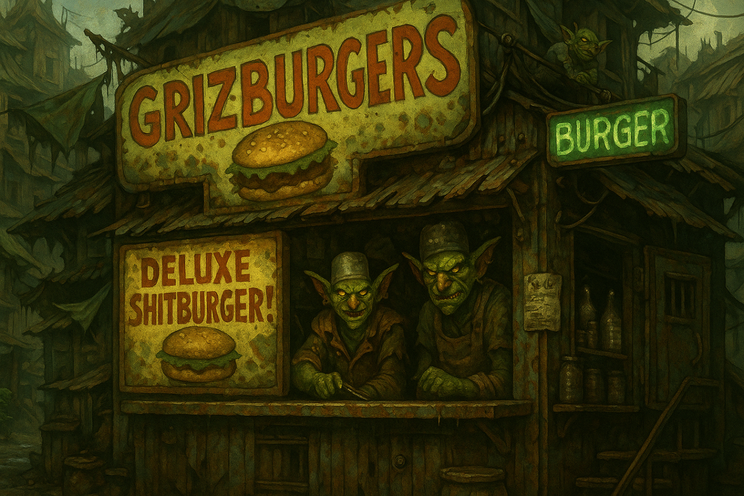 In the fetid heart of Grizburg's Rustwater District, where industrial runoff mingles with goblin ambition, stands the most notorious culinary venture ever to poison mortal palates with gleeful malice. Grizburgers emerged from the fevered entrepreneurial dreams of Skreet and Mangle, two goblins whose previous enterprises included selling "medicinal" rat droppings and operating an unlicensed body-part brokerage. When the Rust Barons cracked down on their organ trafficking operation, the enterprising duo pivoted to what they termed "revolutionary sustenance distribution"—though their customers learned to call it something far less charitable. The establishment's crowning achievement, the Deluxe Shitburger, represents either the pinnacle of goblin innovation or the nadir of culinary civilization, depending on one's tolerance for ingredients that defy both identification and digestion. Skreet claims the secret lies in his proprietary blend of "meat-adjacent protein sources," though whispered rumors suggest the patties contain everything from sewer rats and discarded shoe leather to the occasional finger lost by careless dock workers. Mangle handles the "flavor enhancement process," which involves dunking each burger in a vat of what appears to be River Vo runoff mixed with fermented cabbage juice and the tears of disappointed customers.Ate there once during my smuggling days. The burger tasted like it had been marinated in orc piss and regret, but damned if it didn't keep me full for three days straight. Haven't been able to taste anything properly since.The ramshackle wooden structure groans under the weight of its own audacity, constructed entirely from salvaged materials that Skreet and Mangle "liberated" from various demolition sites around the city. The grease-stained signs, painted in what customers hope is merely rust-colored pigment, advertise their wares with the sort of brazen honesty that would be refreshing if it weren't so deeply disturbing. The cooking area remains visible through gaps in the rotting planks, allowing patrons to witness the full horror of their meal's preparation—a transparency policy that has somehow increased rather than decreased sales, as morbid curiosity proves stronger than survival instinct. The clientele represents Grizburg's most desperate or adventurous souls: dock workers seeking cheap sustenance, mercenaries too drunk to care about food quality, and the occasional House Brinkburn engineer conducting what they claim are "metallurgical experiments" on the burger's indigestible components. Regular customers develop a peculiar immunity to both disease and conventional notions of edibility, with some claiming the Deluxe Shitburger grants temporary resistance to poison damage—though this may simply be their digestive systems surrendering all pretense of normal function.