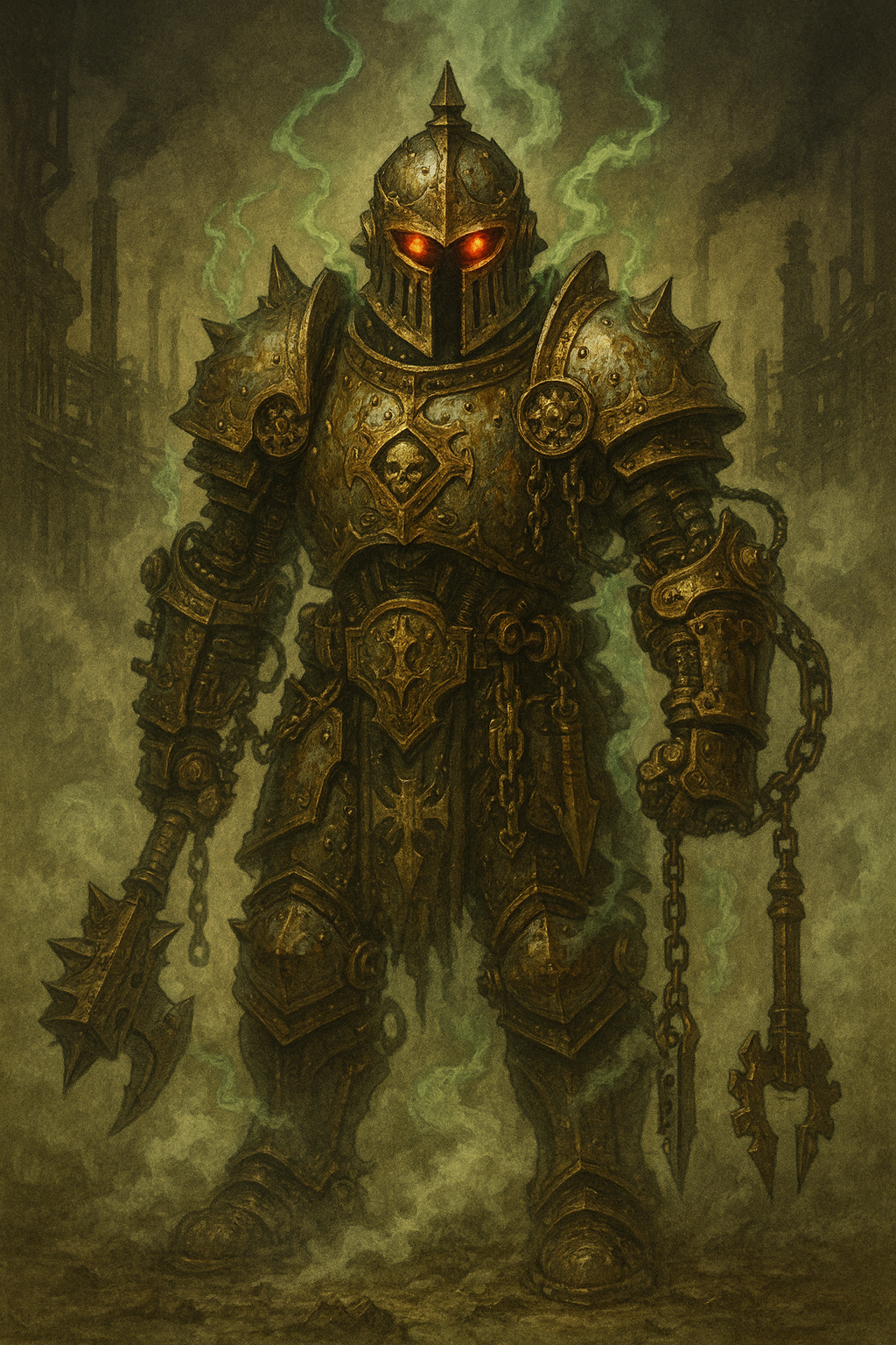 In the toxic twilight of Grizburg's industrial hellscape, the Helmed Horrors represent the ultimate fusion of necromantic sorcery and mechanical engineering—a grotesque marriage of soul-binding techniques perfected over centuries at Dreadmil. These are not mere animated suits of armor but industrial revenants, created through processes that would horrify even the most hardened practitioners of forbidden arts.