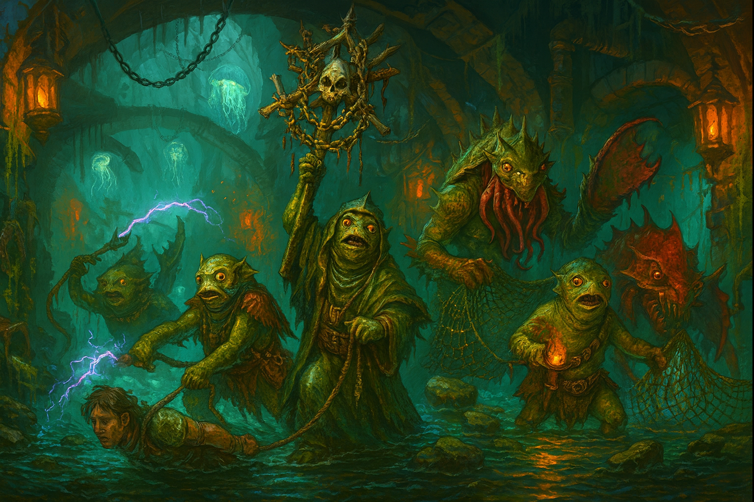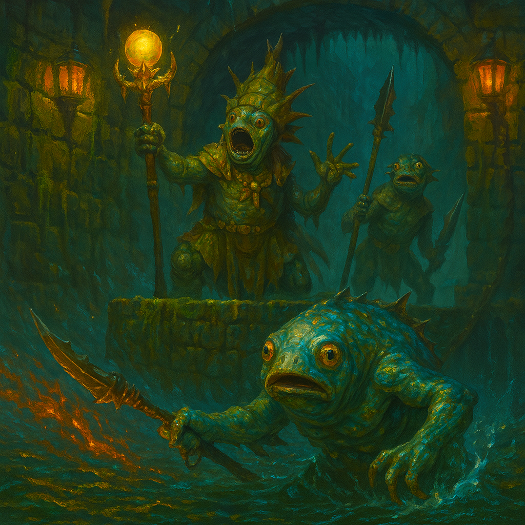 The kuo-toa of Grizburg are more than raiders; they are a drowned people clawing for divinity. They embody the paranoia and hunger of the canals themselves, dragging the unwary into a world of madness where gods can be made of trash and blood. ---Voices from the Canals
