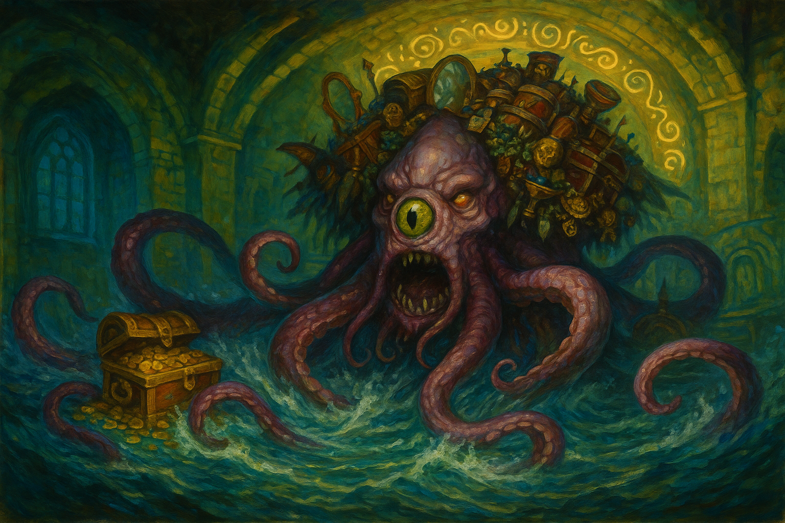 Its lair is a spinning gyre of rooms and refuse beneath Grizburg’s oldest cisterns, reachable only by folding paths or dream-steps. The walls weep brine; the floors are choked with coins from every age. Windows open to alien stars. Some say time loops in its tunnels, others say it stops altogether.Behavior