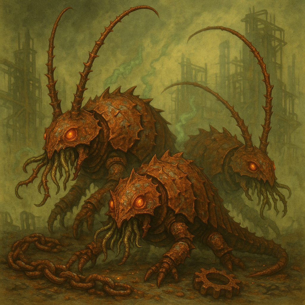 Grizburg’s rust monsters are not the pale cave-scuttlers whispered of in surface tales. Their shells glimmer with the red-black sheen of forge slag, pitted and lacquered with river oils that catch the lanternlight in rainbow slicks. Antennae plume outward like smoking ferns, glowing faintly green from toxins leeched out of the Sko. Their bodies are patched with rivets and scraps they’ve eaten and reformed—beetles built of their prey, walking monuments to decay.