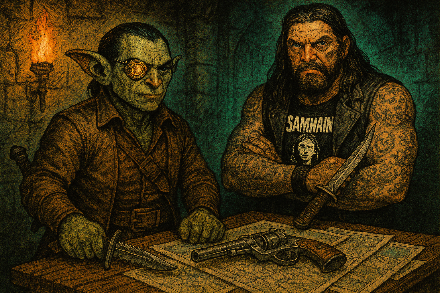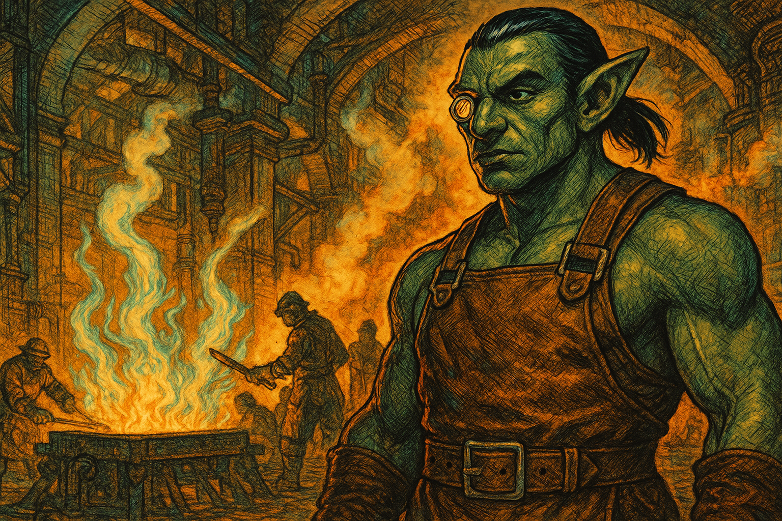 The Rustleech nosed through the stagnant canal-docks of Grizburg beneath a bruised and weeping sky, her iron hull coughing smoke into air thick as grave-shrouds. Captain Malista Tinmaw's coin had purchased the silence of guards whose disinterest bore a price—within these hundred-foot walls of corroded steel and fungal stone, the city breathed like some ancient forge, iron lungs sighing ash into the perpetual twilight. Already the massacre at Greenglade had taken the shape of legend in dockside whispers. Fouk Shadim, master of whispered deception, tended their crafted lie like a gardener pruning poison vines, inserting details that made fiction bloom into accepted truth. In Grizburg, where every insect wing and rusted pipe might carry rumor to listening ears, controlling the story meant survival. The city revealed her secrets in fragments: cable cars swinging like hanged mortals across the upper reaches, furnaces belching blue-black smoke into the eternally gray sky, crooked bridges spanning the Sko River's oily sheen. Goblins filled the twisted streets—more hob than bog—and every surface fought for the same cursed ground. Valdin departed briefly to tend diplomatic formalities, his papers buying freedom of movement where others might find only chains. When he returned, Kurgan led the company into the heart of Dreadmil, the great iron fortress that crowned the city like a cancer. There waited Slazgar Two-Eyes. Smaller than his bloody reputation suggested, yet the chamber filled with menace at his presence. One flesh eye burned bright as forge-fire; the other, a jeweled parasite that whirred and clicked, never ceased measuring truth from falsehood. His grin was a scar given voice.Yer pasts lie on this table—maps, routes, faces ye once swore to. Prove t' me ye've cut 'em loose. Give me somethin' sharp, somethin' useful—or ye'll burn in me furnaces.The tests began with the weight of judgment. Each member of the company faced Slazgar's grinding interrogation: Fouk answered with cold arithmetic when pressed about loyalty versus profit—restraint sharpened by greed, the kind of calculus Slazgar respected. BöötMóöntch met questions about the Whispering Depths with silence heavy as a tomb, the stink of darkness clinging to his flesh like proof of passage through forbidden places. Sherman spat defiance when challenged about his brother's ghost, the fire in his words earning Slazgar's approval: a rage that spits in the face of death itself. Valdin's diplomatic knowledge proved thin, drawing the narrow-eyed suspicion of the jeweled eye. Thronn laid bare hidden knowledge—that the Eyes of Tezra had presence in Grizburg, and his intent to destroy Chief Gruznak the Ruthless. The revelation that Gruznak still bore the teeth-marks of Thronn's dead brother Gherman drew Slazgar's hungry attention.