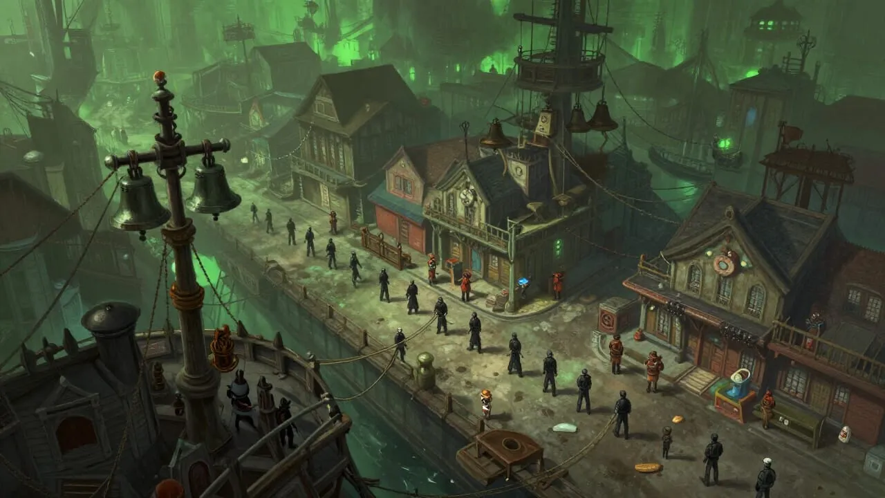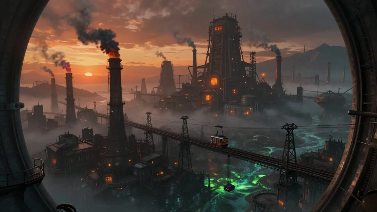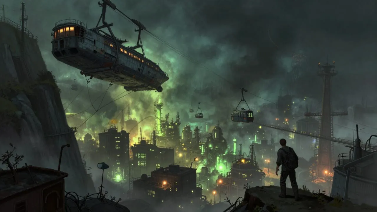 The return journey proved more eventful than the diplomatic meetings themselves. Valdin chose the cable car route that would carry him above the city's toxic streets, offering a bird's-eye perspective on districts he had only observed from ground level. The conveyance swayed gently as it crossed over Sinkhole Ward—the drowned neighborhood that had once been called Northward before the ground itself surrendered to chemical erosion and collapsed into the poisoned waters below.