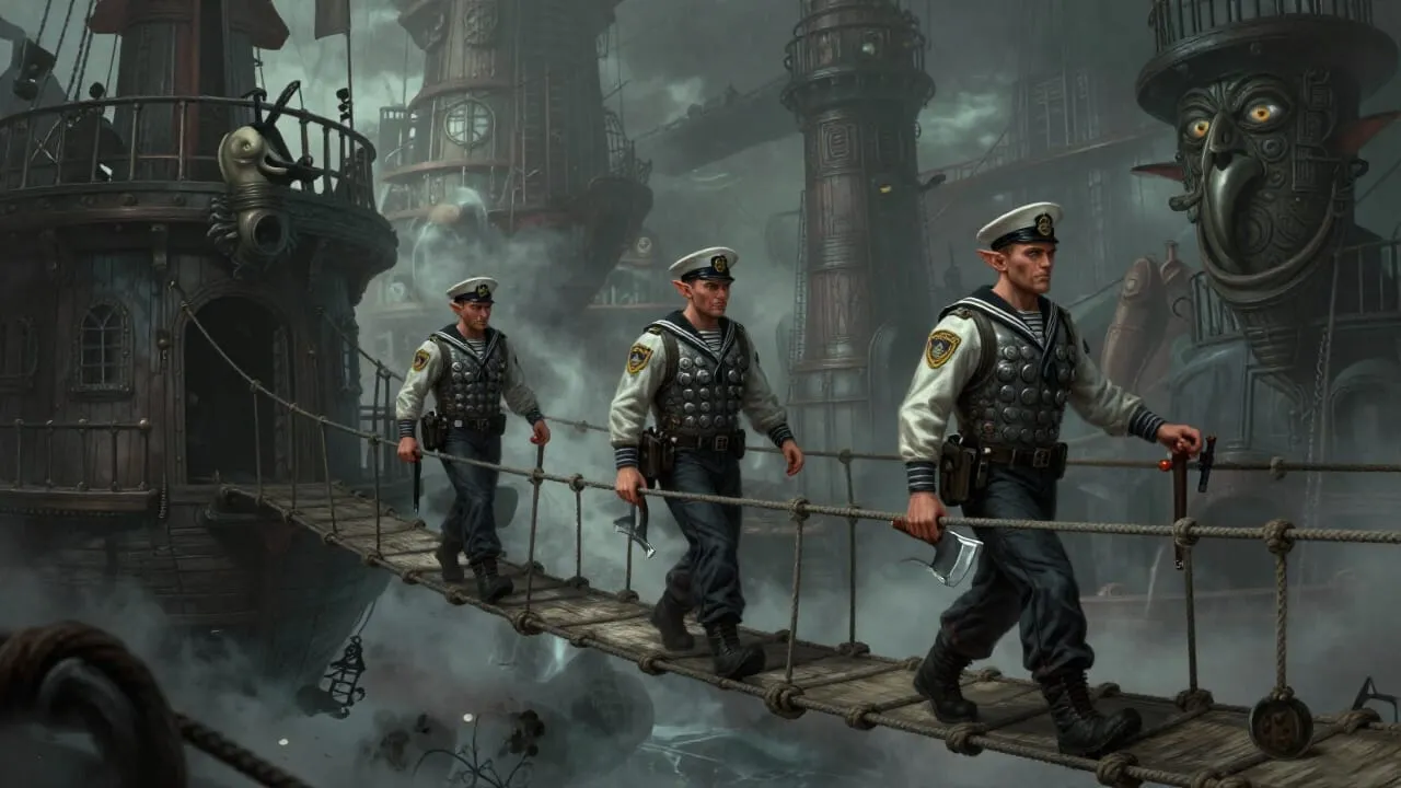 The party reunited at the Listing Merchant Tavern in Barnacle Hill, where Fouk and Thronn had established their reconnaissance position days earlier. The landlocked clipper ship that housed the establishment tilted at its perpetual angle, forcing new arrivals to adjust their balance as they navigated the maze of nautical salvage that served as furniture and decoration. Ship's bells announced each entrance, their bronze voices marking time in naval fashion regardless of the hour.