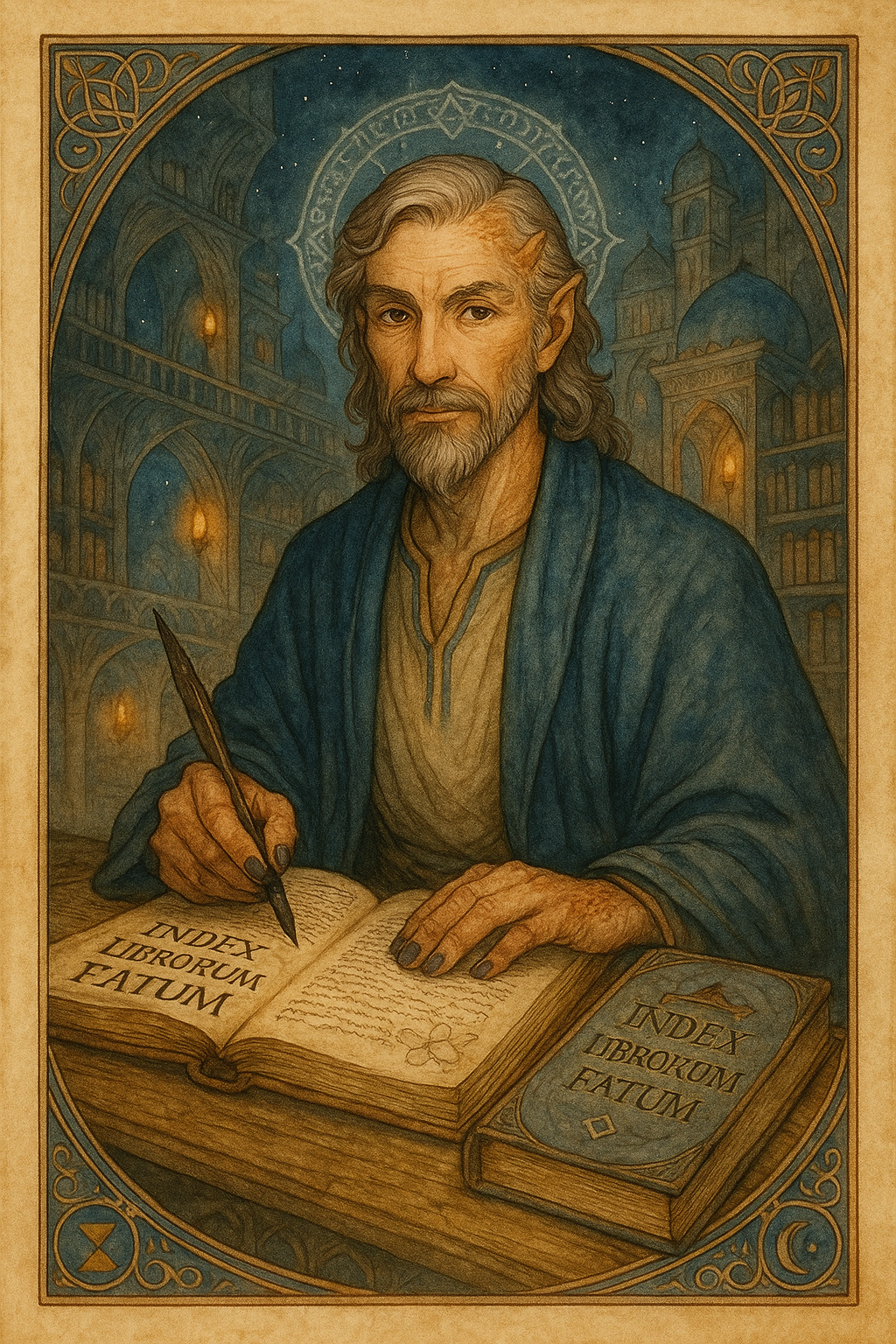 Manche behaupten, er sei weniger ein Bibliothekar als vielmehr der erste Chronist selbst, ein lebendiger Index, der die Wege der Sphären in seinem Gedächtnis trägt. Andere halten ihn für ein notwendiges Gegenstück zur Bibliothek: Wo sie sammelt, ordnet er; wo sie wächst, deutet er; wo sie schweigt, erinnert er.