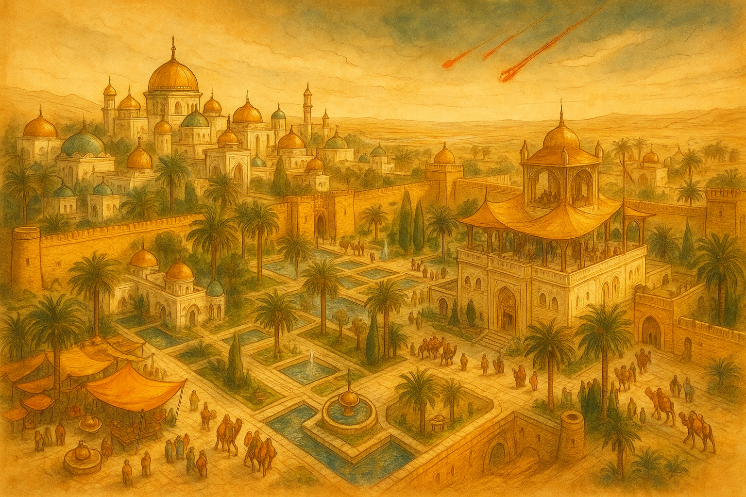 Seit jener Zeit leuchten in manchen Nächten ferne Dünen rot, und wer es wagt, dort zu graben, findet in der Tiefe geschwärzte Steine und samenlose, bittere Kerne. Manchmal zeigt sich im Hitzeflimmern eine Fata Morgana: niedrige Kuppeln, ein Tor mit eingelegter Perlmutter, die Spiegel eines stillen Hofes. Es heißt, wer dann nach einem goldenen Apfel greift, vergisst seinen Namen und findet nie heim; wer aber nur Wasser ausgießt und den Sand damit tränkt, hört für einen Herzschlag Kinderlachen und das Rauschen eines lebendigen Gartens—und geht weiter, leichter als zuvor. Manche Karawanenführer schwören, in den Brandkreisen der Safransteine wachse nachts ein Gras, das den Durst löscht. Andere sagen, dort schweben die Schatten derer, die hätten leben können, hätte jemand rechtzeitig geteilt.