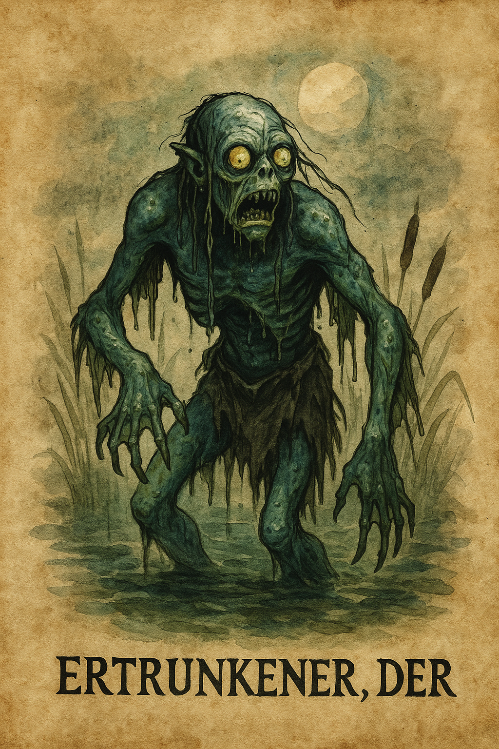 Wesen & Ursprung: Ertrunkene sind Schurken und Unglückliche, deren Leben im Wasser endete – lebendig ertränkt oder nach dem Tod in Tiefe geworfen. In kalter, dunkler Flut verformen sich ihre Leiber; der Hass bindet sie an Ufer, Stege und seichte Buchten, wo sie den Lebenden auflauern.