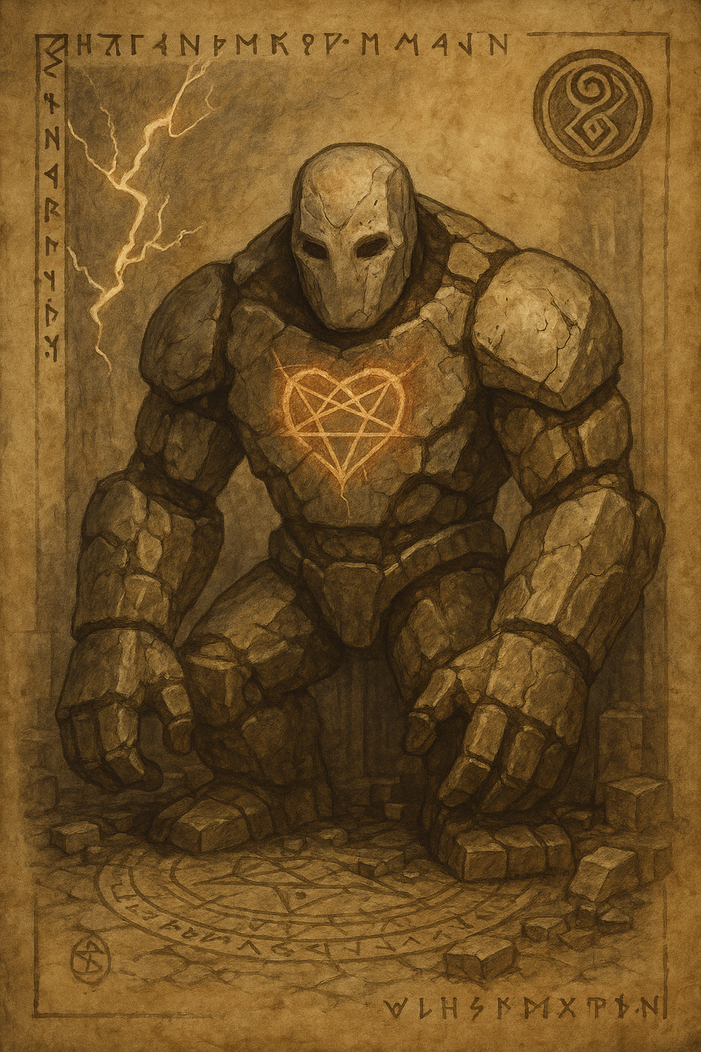 • Gewöhnliche Klingen richten wenig aus; setze auf Wucht, Risse im Material und gezielte Angriffe auf Runenplatten. • Distanz wahren: herabstürzende Trümmer und geworfene Brocken sind ebenso gefährlich wie die Fäuste. • Befehlsketten prüfen: Manchmal lässt sich der Golem durch das widerrufende Wort oder das Gegen-Sigill deaktivieren – falls bekannt.Stats: