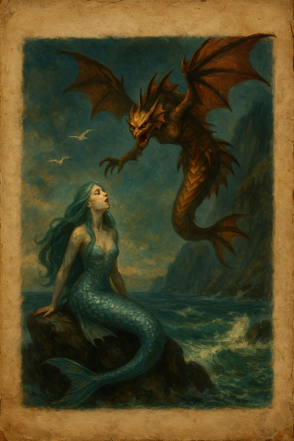 Schwächen & Gegenmittel: • Zwinge sie zur Landung: Flossen/Schwimmhäute beschädigen (Bolzen, Haken-Netze, Kettenschrot). • Schutz gegen Gesang: Wachsstopfen, Schalhauben, Glockenschlag oder Signalhörner kontern die Betörung. • Waffenwahl: Silber greift (Klingen/Spitzen). Geweihtes Salz und geölte Seile (anti-aquatisches Öl) hemmen Griff und Wundheilung. • Taktik: Nicht ausholen—kurze, schnelle Stiche. Bordwände sichern, Relingnetze schließen, niemand allein an der Kante.