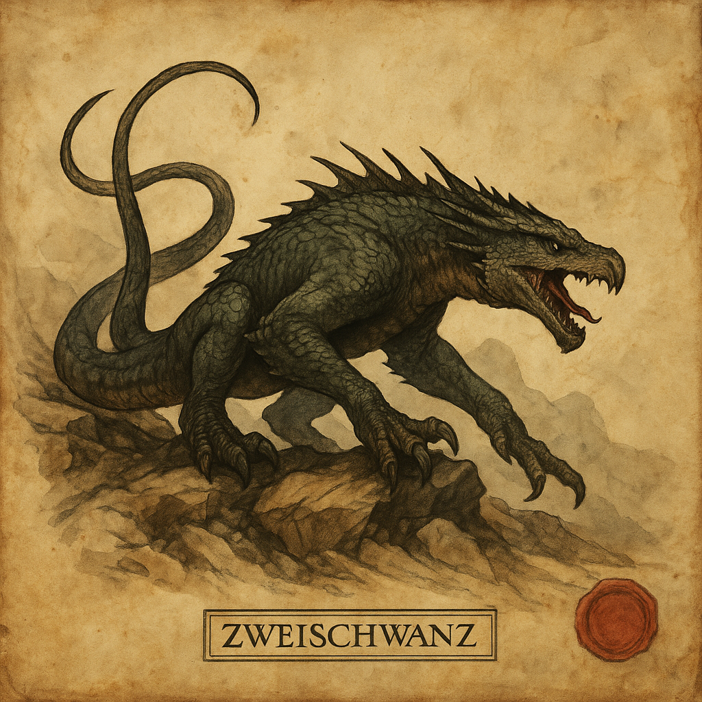 Kampf & Taktik: Im Kampf deckt der gegabelte Schwanz zwei Richtungen zugleich ab; wer seitlich Abstand hält und diagonal ausweicht, lebt länger. Der Schädel ist stark gepanzert, doch die Flanken hinter den Schulterblättern geben nach. Netze, Haken oder Ketten, die an der Schwanzbasis fassen, nehmen der Bestie Gleichgewicht und Reichweite. Magische Talente besitzt der Zweischwanz nicht, auch „Drachenfeuer“ fehlt. Er reagiert überdurchschnittlich empfindlich auf grelles Licht und Lärm – Blendpulver und Schall (Hörner, Donnerkeile) stören seine Orientierung –, während nasse, schlammige Böden seine Sprungkraft und Traktion mindern. Als Beute lohnen widerstandsfähiges Schuppenleder, Zähne und die Knochensporen der Schwanzspitzen (für Ritualdolche oder Pfeilspitzen das Fett veredelt Zähigkeits-Öle, die Klauen taugen als Zier und Tauschware.
